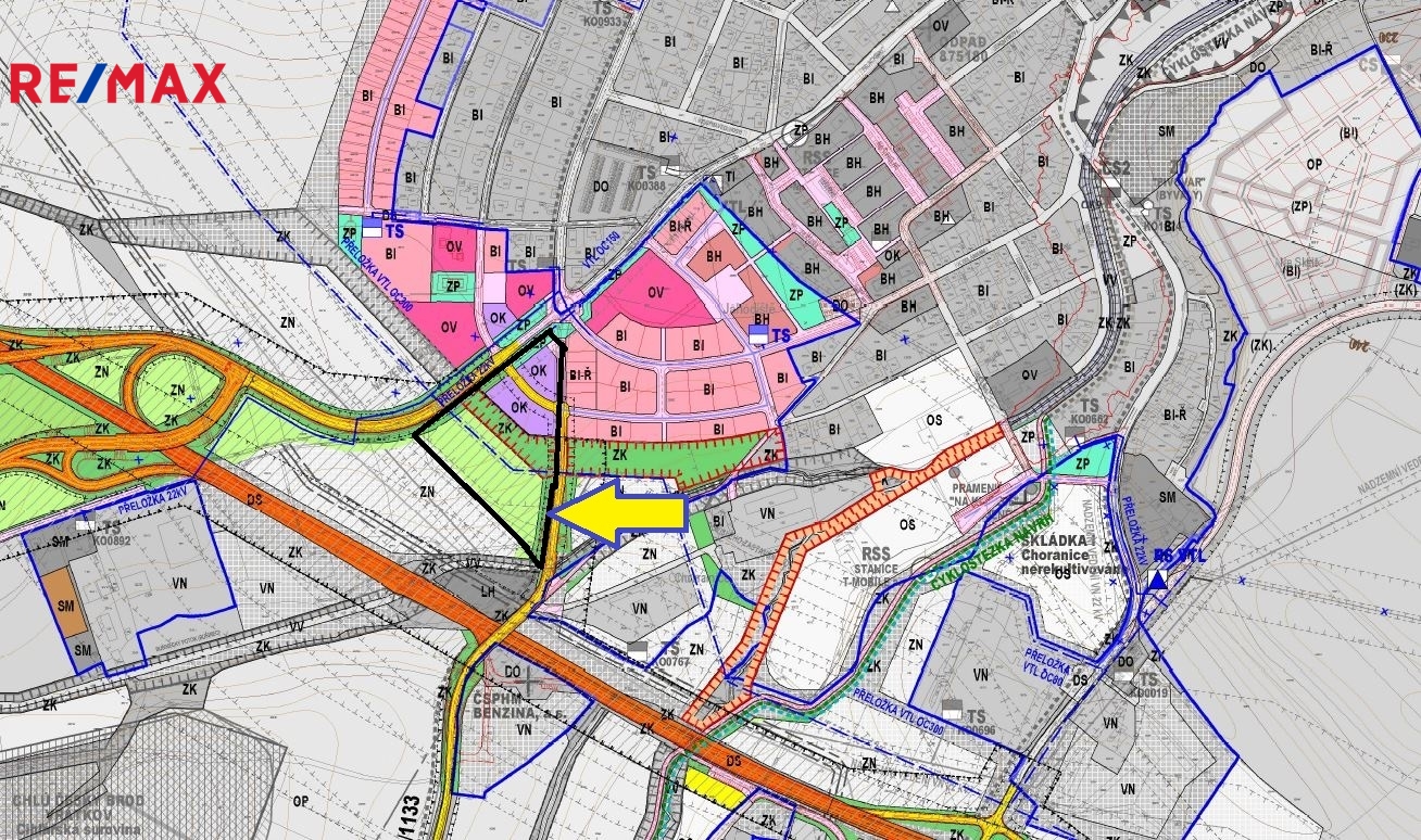 Komerčně obchodní pozemek je v UP je vyznačeno „ OK“ (plochy občanského vybavení, služby, obchod) k výstavbě určeno cca 5000m2 z celého pozemku, které jsou rozděleny komunikací.