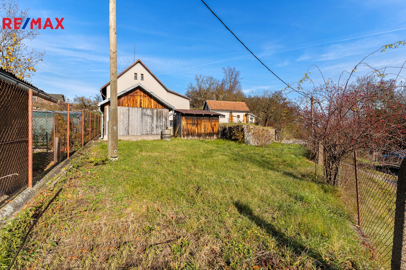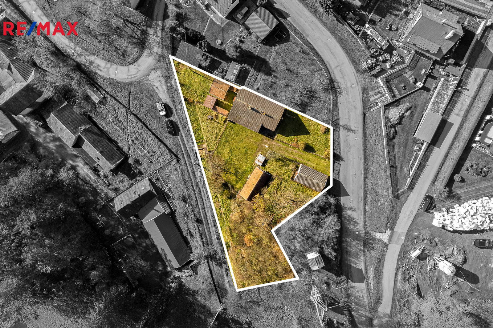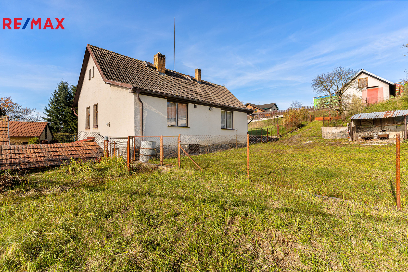 Nemovitost stojí na prostorném, jižně orientovaném pozemku o celkové výměře 1 455 m² a kromě samotné chalupy k ní náleží také soubor vedlejších staveb – zděné i dřevěné kůlny a zděné garáže, které poskytují dostatek prostoru pro dílnu, skladování i parkování.