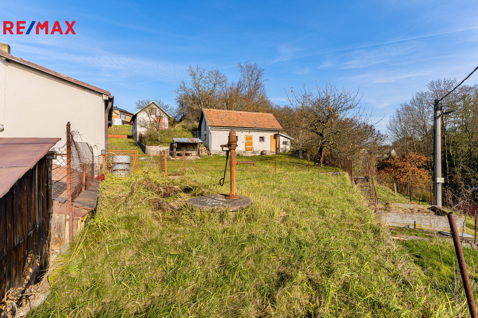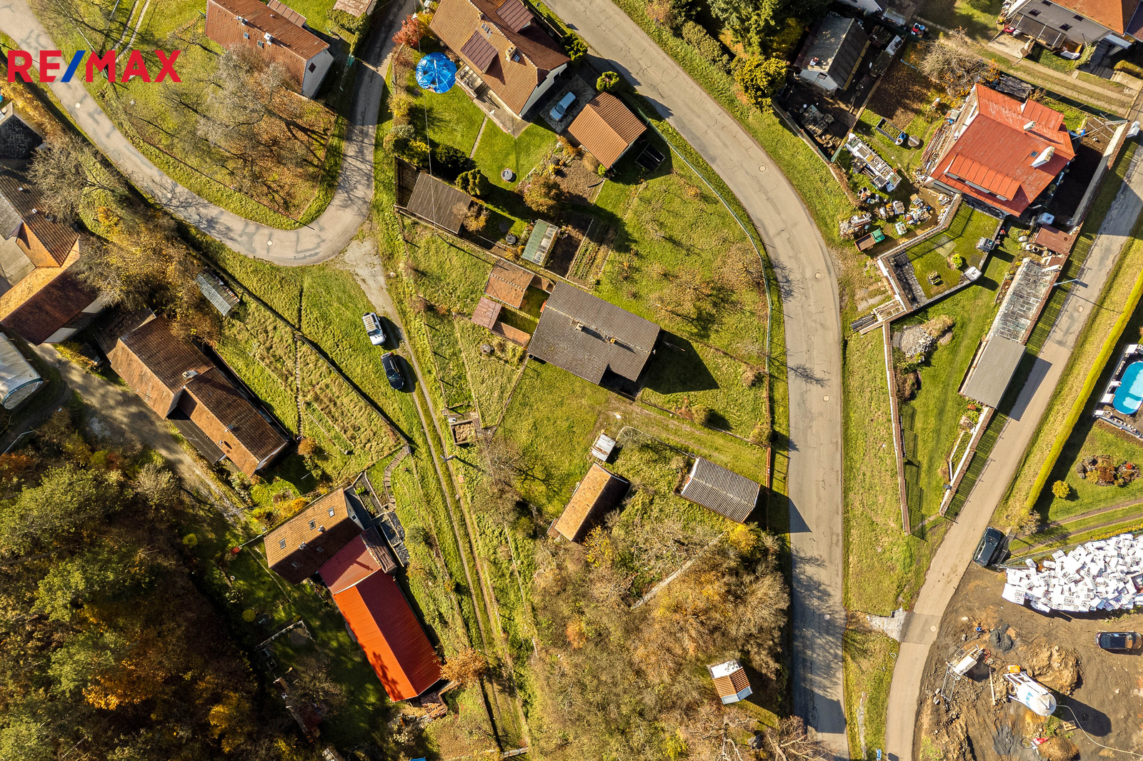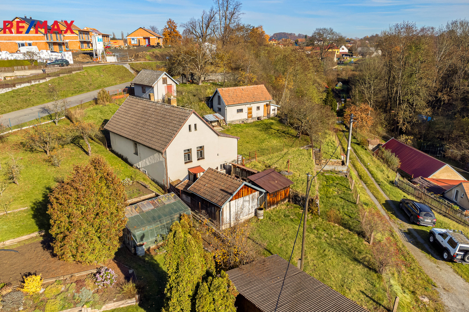Nemovitost stojí na prostorném, jižně orientovaném pozemku o celkové výměře 1 455 m² a kromě samotné chalupy k ní náleží také soubor vedlejších staveb – zděné i dřevěné kůlny a zděné garáže, které poskytují dostatek prostoru pro dílnu, skladování i parkování.