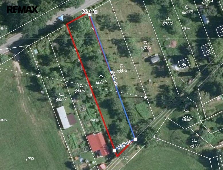 Jedná se o rovinatou plochu téměř pravidelného tvaru o půdorysu cca 13x 72 m , celková plocha zahrady je 1.030 m2. Zastavitelnost pozemku je nyní možná jen zahradním domkem. Na pozemku je několik ovocných stromů s dobrou výnosností ovoce (jabloně, švestky, třešně, špendlíky, hrušně, ořešák). Pozemek je celý oplocený, málo udržovaný, s možností parkování uvnitř. Příjezd po nezpevněné komunikaci.