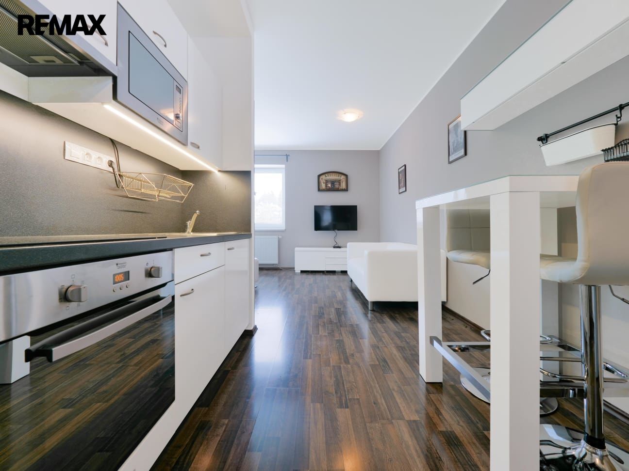 Do bytu se vchází prostornou předsíní (5,05 m2) kde je i koupelna se sprchovým koutem a toaletou (4,45 m2), následuje kuchyňský kout se všemi vestavěnými spotřebiči a prostorný obývací pokoj (25,05 m2) s orientací na JV a SZ. Byt je vybaven moderním a kvalitním nábytkem v bílé barvě, okna jsou plastová, na podlahách jsou plovoucí parkety, dlažba v koupelně a koberec v předsíni. K bytu patří i menší zděný sklep a společná terasa a zahrada za domem.