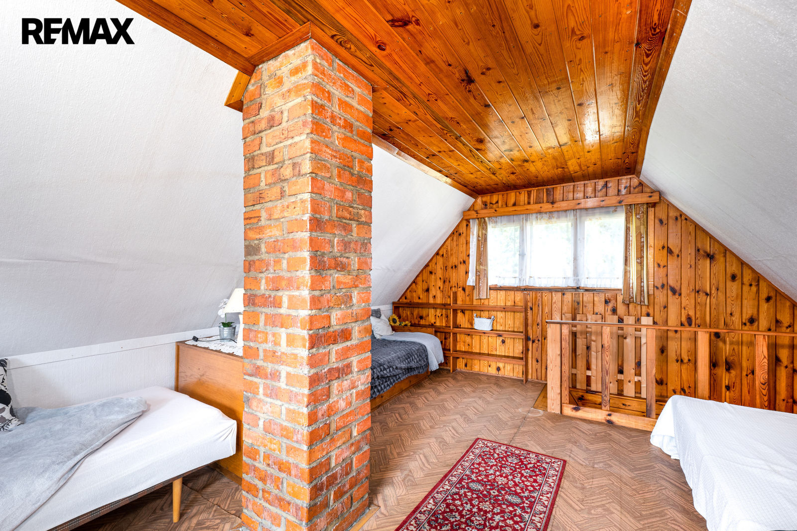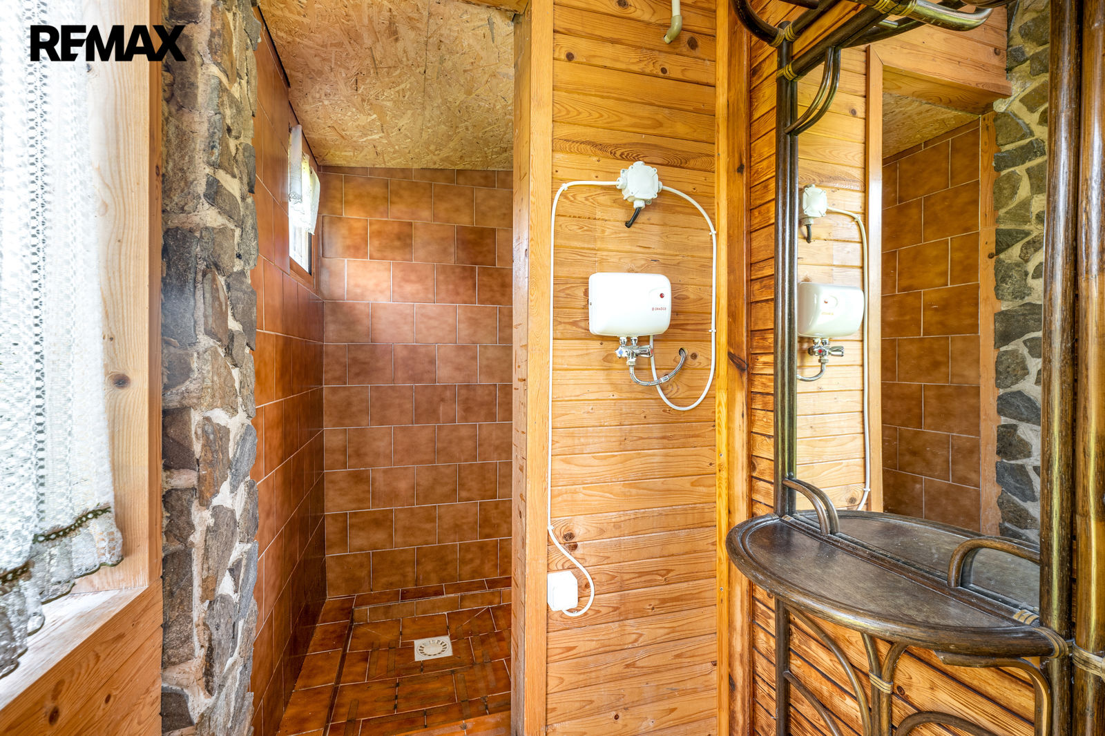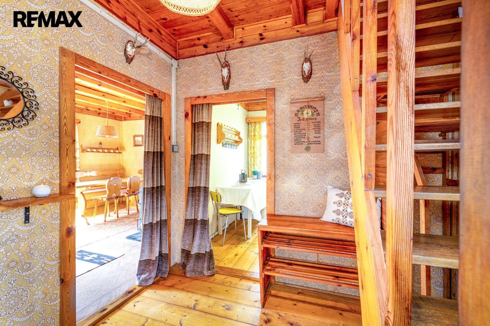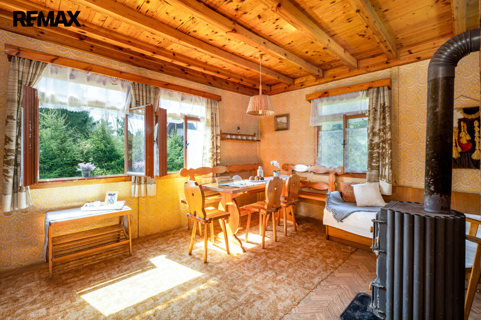 V prvním podlaží se nachází zádveří, menší místnost s provizorním sprchovým koutem, WC, obytná místnost s krbovými kamny a samostatná kuchyňka. V podkroví je prostorná ložnice a balkon. Chata se prodává včetně základního vybavení, popř. je možné dle domluvy ponechat chatu plně zařízenou. Orientační dispozici obytné části s rozměry jednotlivých místností najdete na přiloženém půdorysu.