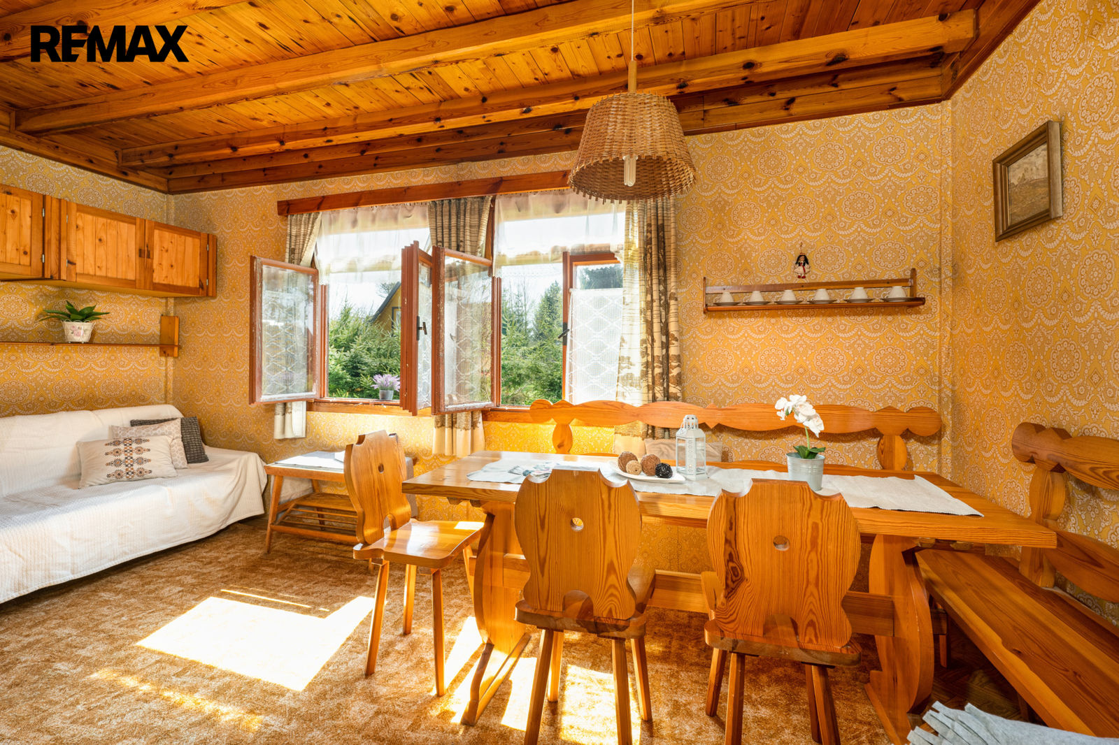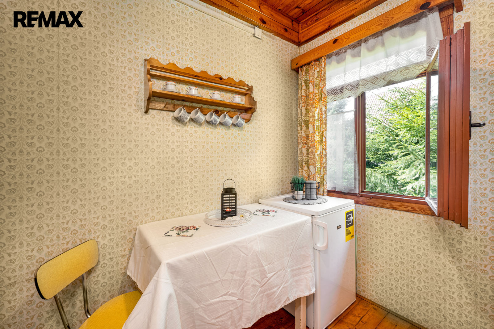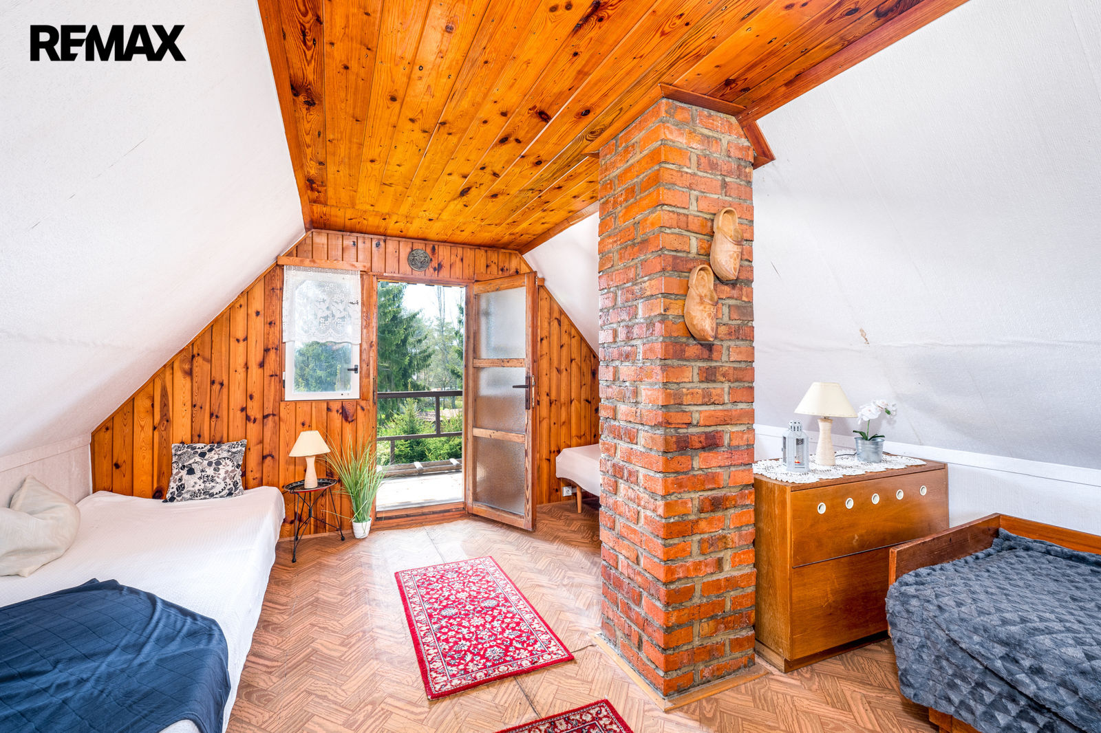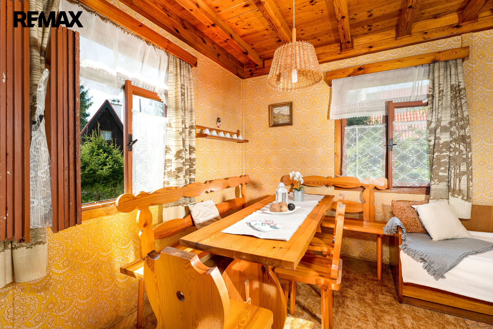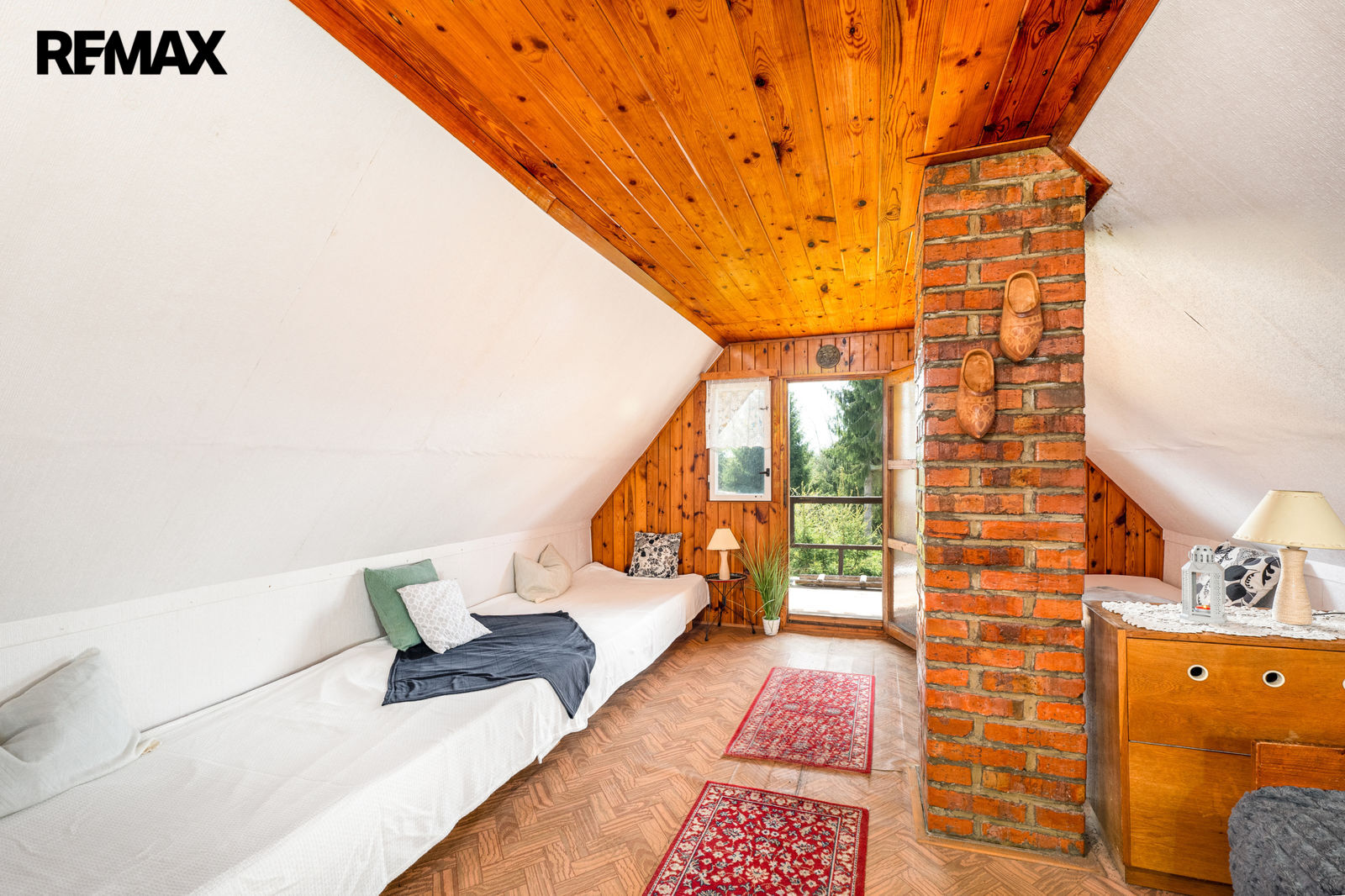 V prvním podlaží se nachází zádveří, menší místnost s provizorním sprchovým koutem, WC, obytná místnost s krbovými kamny a samostatná kuchyňka. V podkroví je prostorná ložnice a balkon. Chata se prodává včetně základního vybavení, popř. je možné dle domluvy ponechat chatu plně zařízenou. Orientační dispozici obytné části s rozměry jednotlivých místností najdete na přiloženém půdorysu.