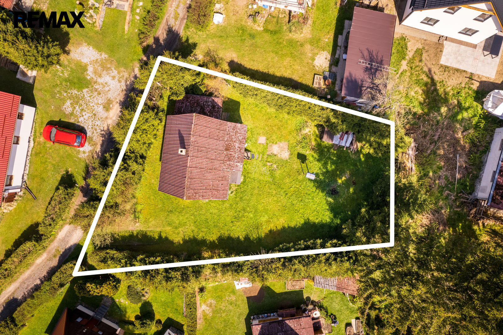 Okolní pozemek je osázen převážně vzrostlými okrasnými dřevinami, které určují také jeho hranici a zaručují příjemné soukromí.