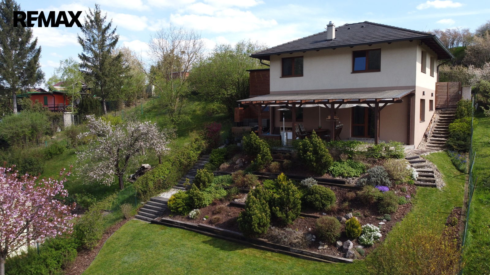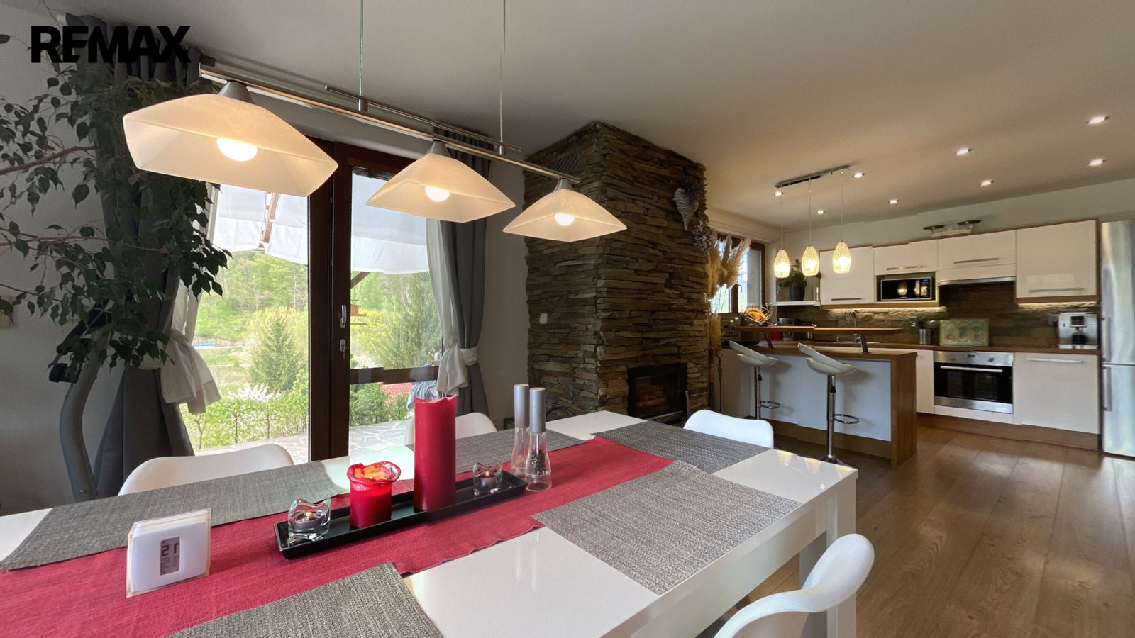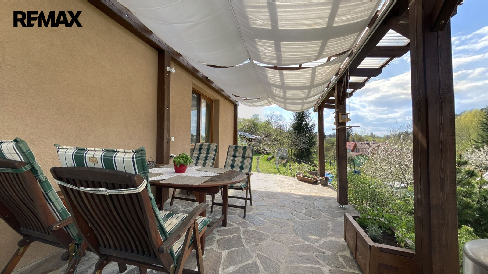 Vstupem z ulice se dostanete do 1.patra, ve kterém se nachází předsíň s úložným prostorem, 3 samostatné pokoje a koupelna s WC a rohovou vanou. V přízemí se nachází obývací pokoj, který je propojen s jídelnou i s kuchyňským koutem. Z obývacího pokoje je přímý vstup na prostornou terasu, ze které je nádherný výhled na okolní zeleň přilehlého údolí. Terasa je zastřešená, a chrání před vlivem nepříznivého počasí.