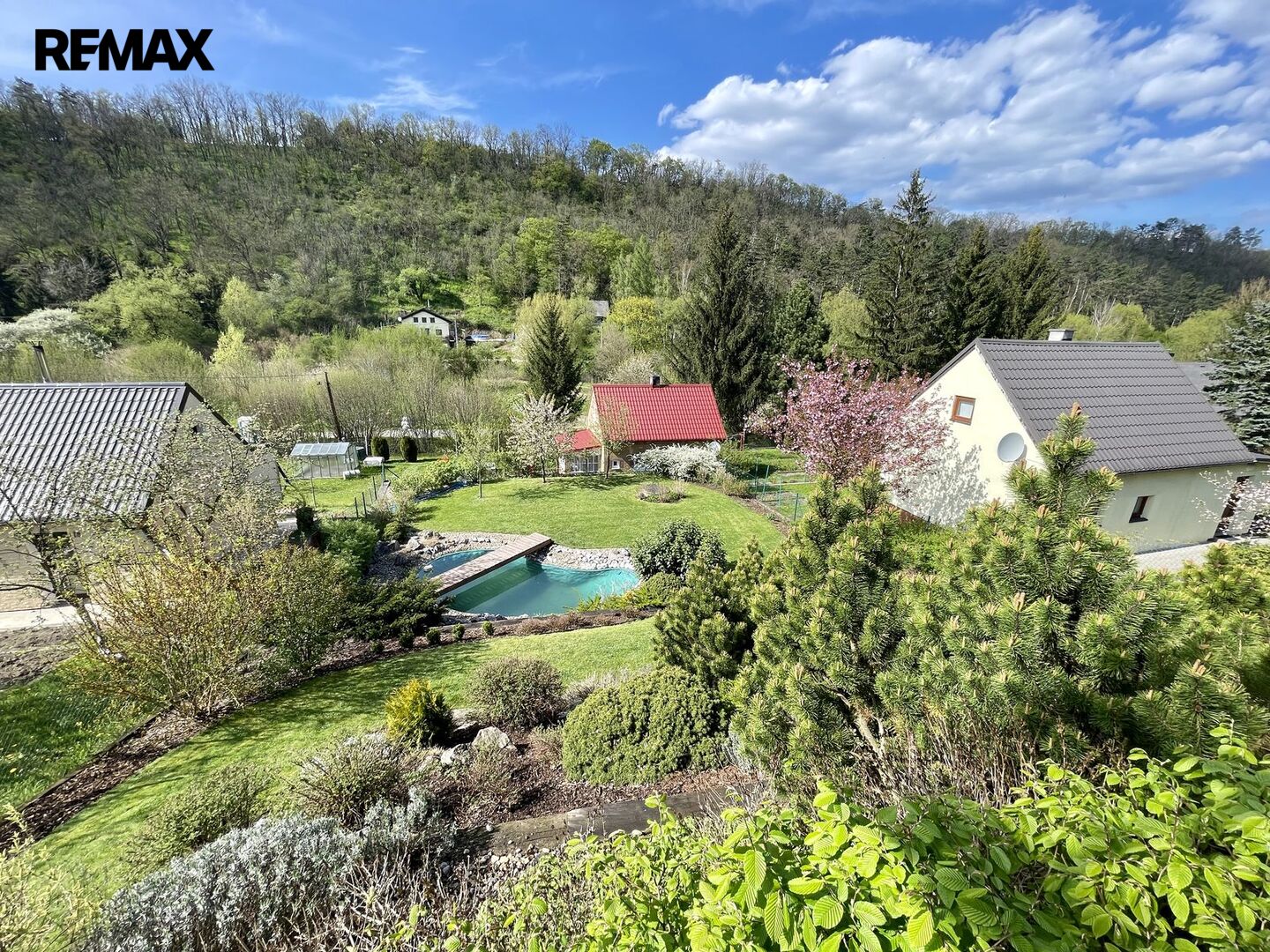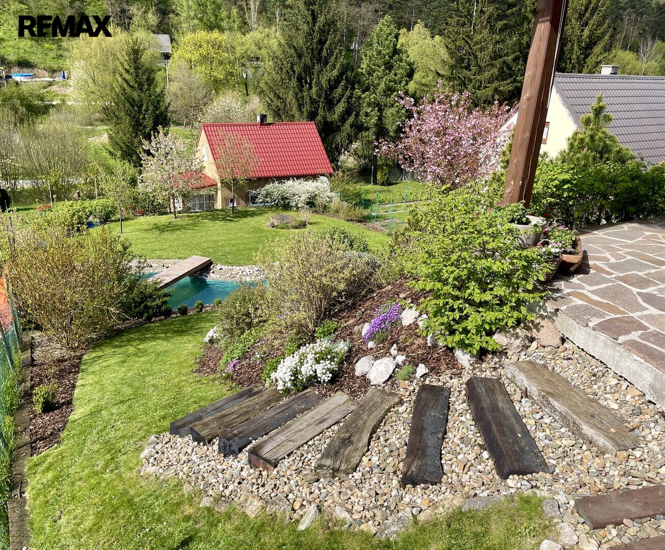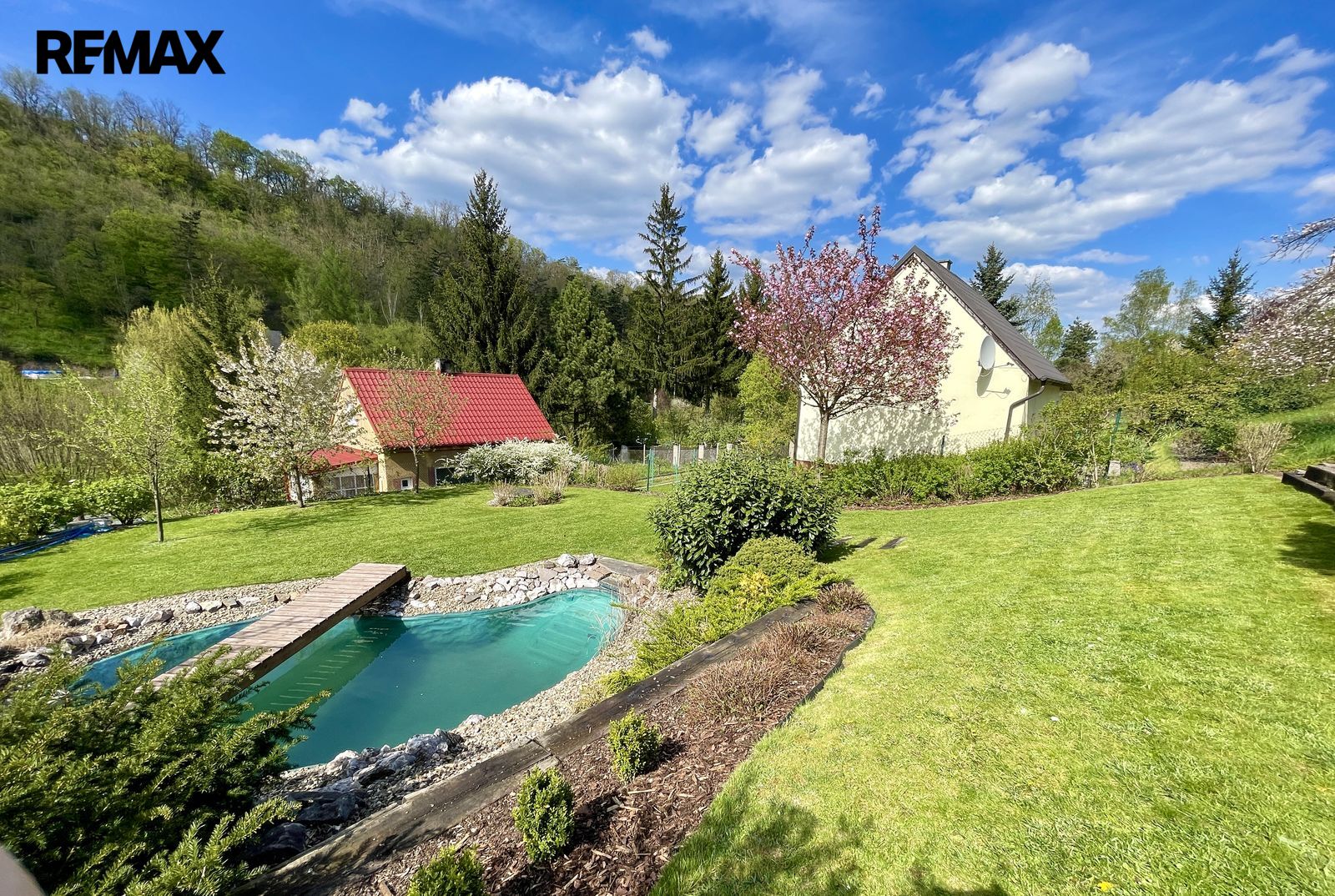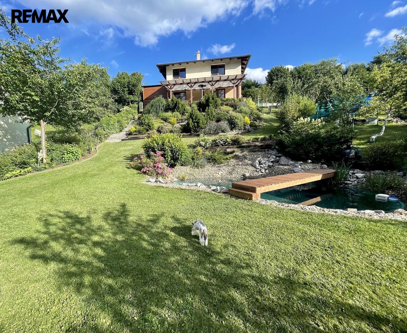 V udržované, krásné zahradě je také přírodní koupací jezírko s lávkou, které je napojeno na bazénovou čistící technologii, pro zajištění čisté vody pro koupací sezónu.