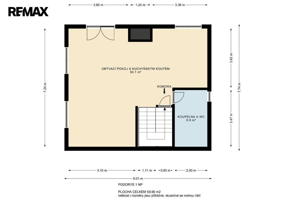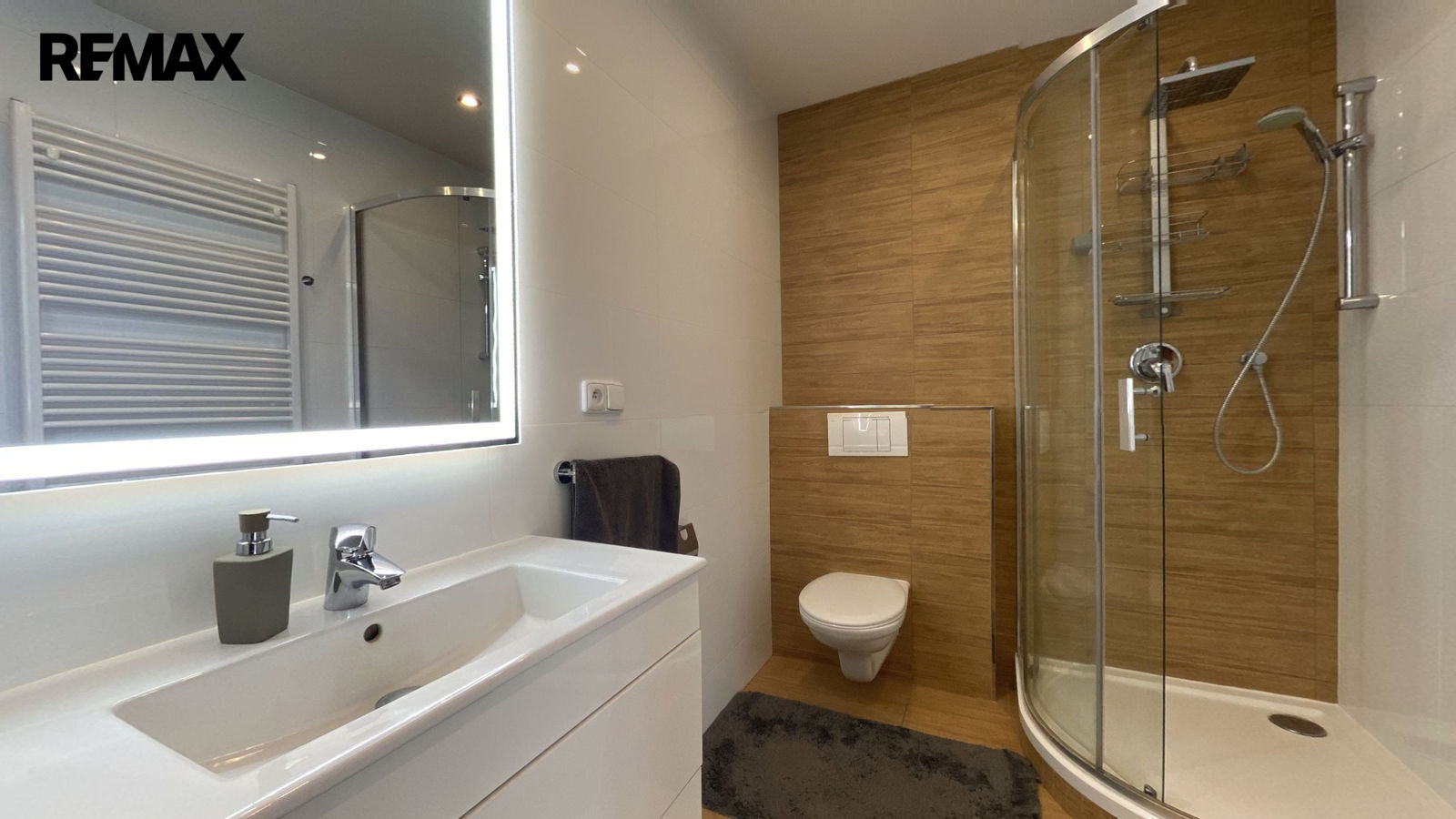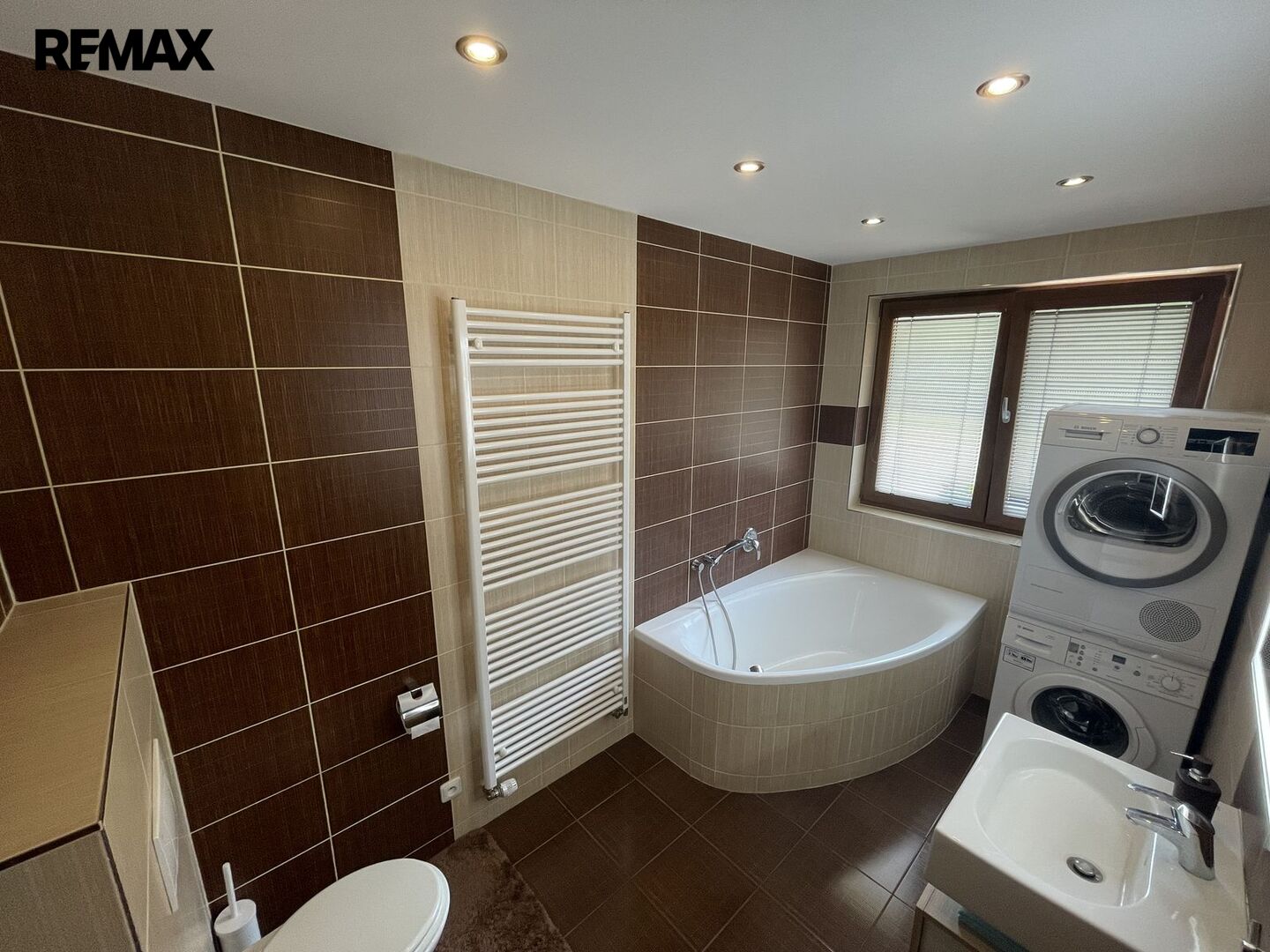 V přízemí je druhá koupena s toaletou a sprchovým koutem a také prostorná spíž, která je umístěná pod schodištěm. Na zahradu můžete vstoupit buď přes terasu z obývacího pokoje, po schodišti z krytého stání, a nebo z druhé strany domu (přímý vstup z ulice).