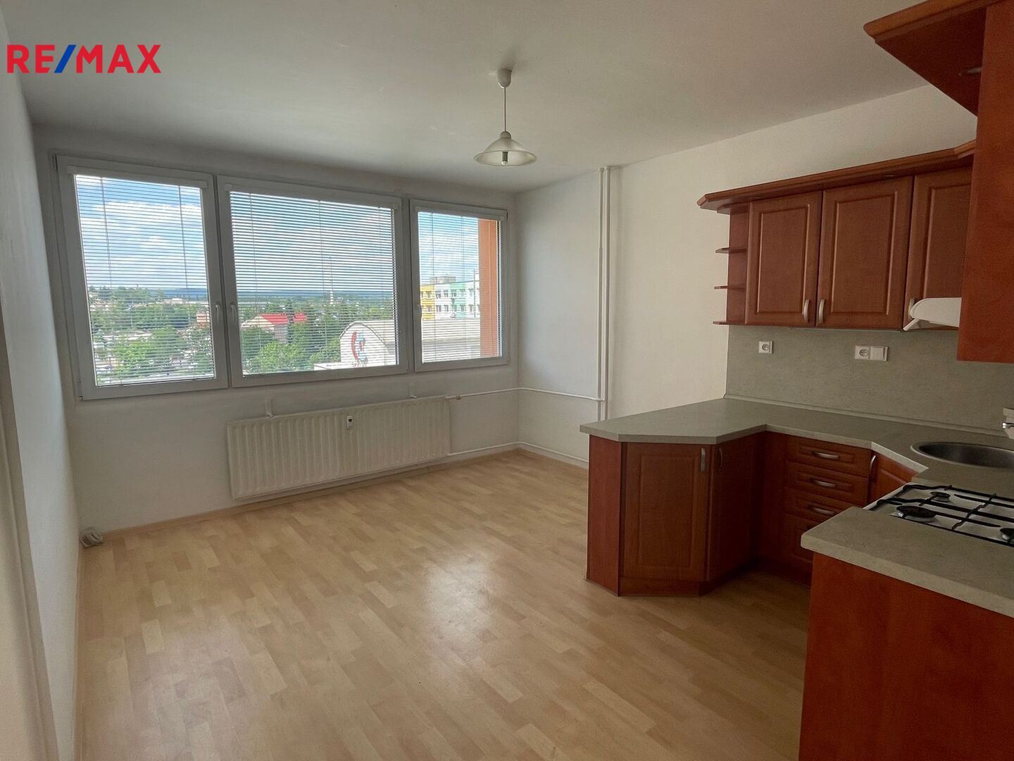 velký obývací pokoj je přepažen na slunný obývací pokoj a druhý pokoj (ložnice) bez okna , dále prostorná kuchyň vybavena kuchyňskou linkou se spotřebiči, koupelna s wc, ze zádveří je vstup do šatny.