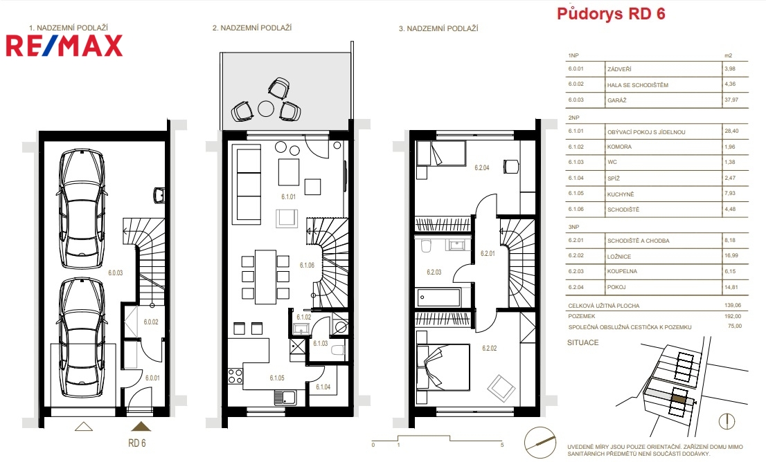 Exkluzivně nabízíme k prodeji řadový dům č.6. Projekt zahrnuje 8 unikátních rodinných řadových domů, realizovaných ve dvou blocích, po čtyřech domech. Představujeme řadový dům č.6. před kolaudací v rozestavěné fázi. Nyní si případně ještě konečný zákazník může říci své požadavky. Jinak bude dodělán do standardu. (Koupelny - odklady, dlažby, zařizovací předměty, vnitřní dveře, obložené schodiště). Pro představu jsou připojeny i již finální fotografie z jednoho řadového domku. Zastavěná plocha domu je 55 m2. Celková plocha pozemku 192 m2. Dispozičně dům nabízí 3.NP, celá jeho plocha je podsklepena. 1.PP nabízí garáž s možným parkování až dvou automobilů za sebou, technickou část, kde je umístěná veškerá technologie pro obslužnost domu. Vstupní zádveří a chodbu navazující na schodiště do 1.NP. V 1.NP nabízí dům velký obývací pokoj s prostorem pro jídelní kout propojený do prostoru kuchyně. Vedle kuchyně je spíž pro uložení potravin a dále se zde nachází i samostatné WC a komora s umyvadlem. Ve 2.NP jsou dva samostatné pokoje, koupelna s vanou, umyvadlem a WC. Velkou výhodou je přístup z obývacího pokoje rovnou do zahradní odcloněné části, kde si můžete odpočinou a relaxovat. V zahradní části lze vytvořit i grilovací zázemí, či hrací zónu pro děti dle svých potřeb.