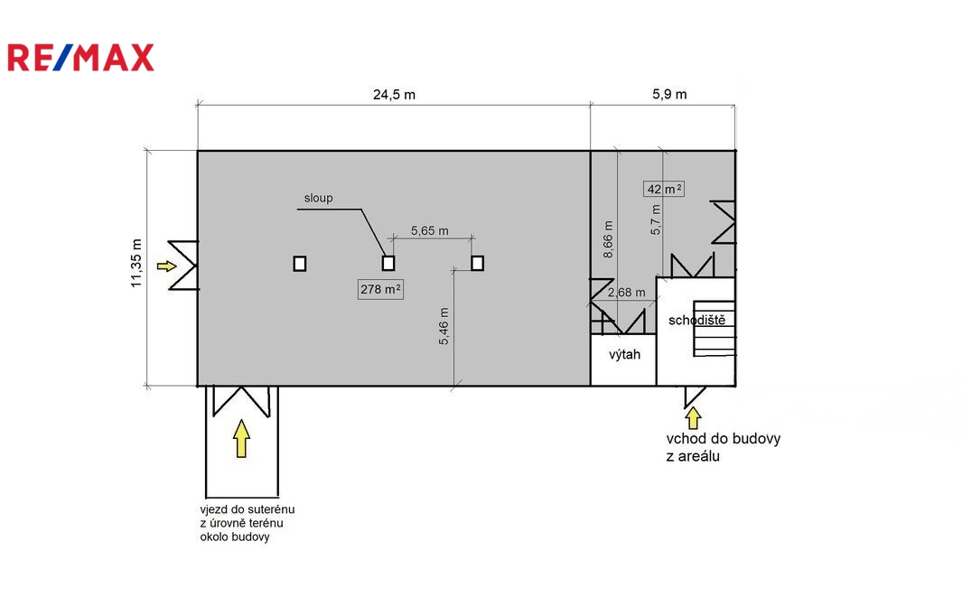 Prostory o výměře 300 m2 se nachází v suterénu hlavní budovy areálu a jsou přístupné z venkovní rampy, vjezdem přes vrata a hlavním vchodem do budovy.