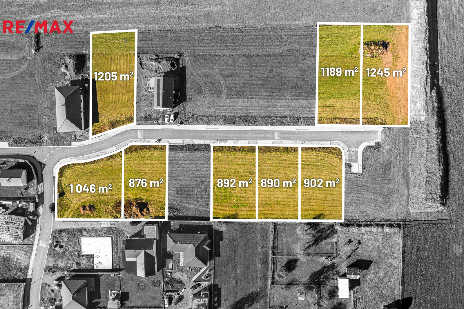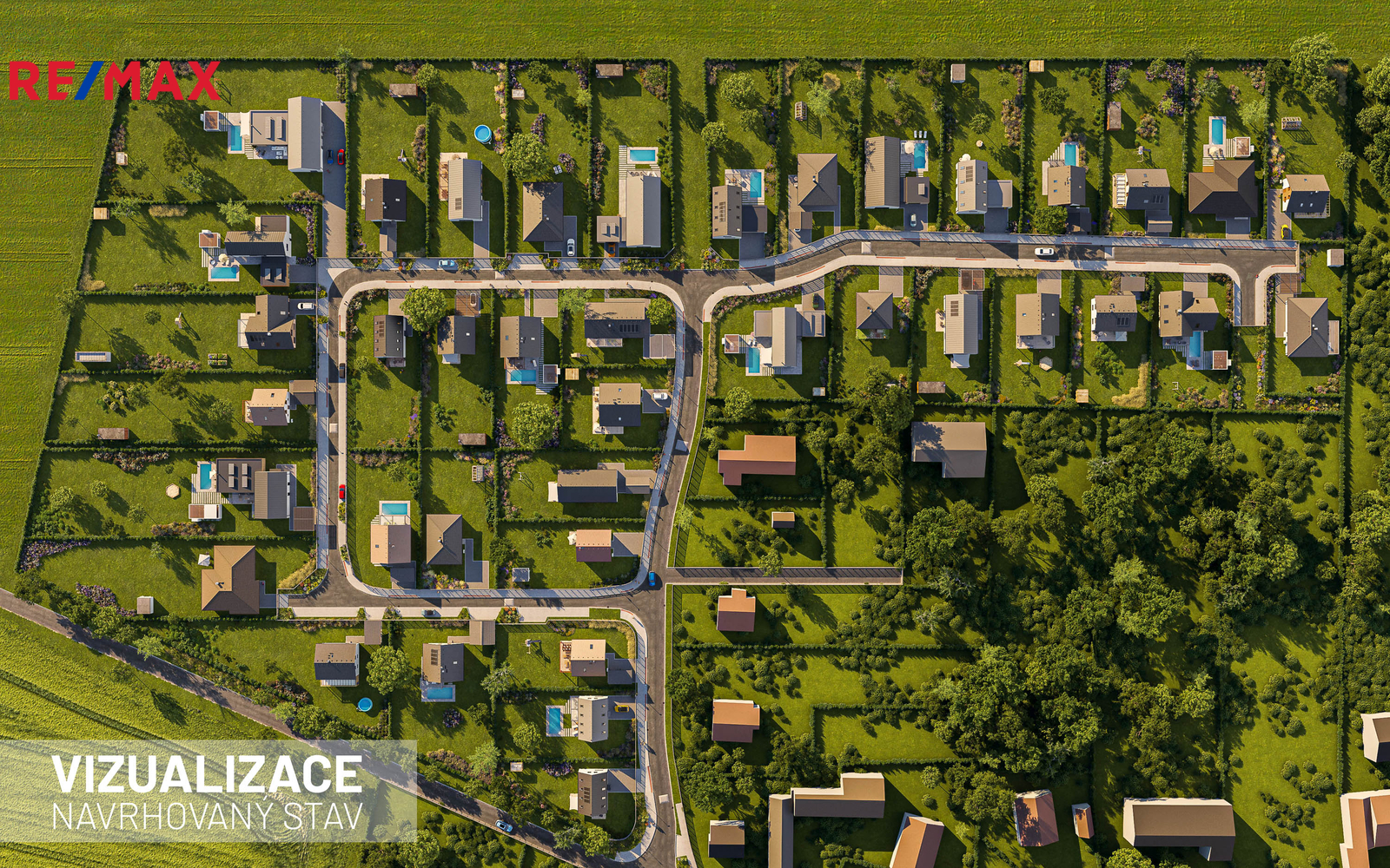 K pozemkům jsou vybudovány příjezdové komunikace, chodníky, vjezdy a parkovací místa.