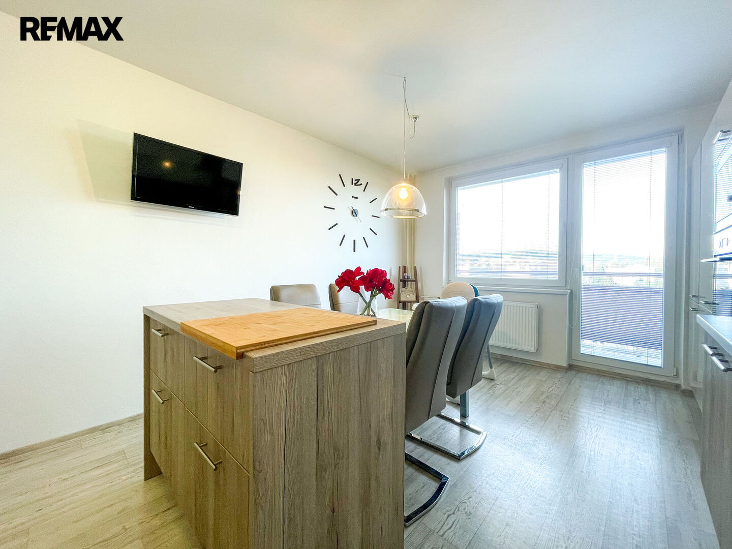Po vstupu do bytu se dostanete do prostorné předsíně, kde je dostatek úložného prostoru pro všechny vaše věci. Dále se zde nachází prostorný obývací pokoj s moderní televizní stěnou. Kuchyň je zde velice velkoryse řešená a disponuje všemi potřebnými spotřebiči. Nachází se zde myčka, lednice s mrazákem, elektrická trouba a mikrovlná trouba, a také plynový sporák. V centru kuchyně je praktický ostrůvek, na který navazuje jídelní stůl. Je zde také vchod na jeden ze dvou balkonů v bytě.
