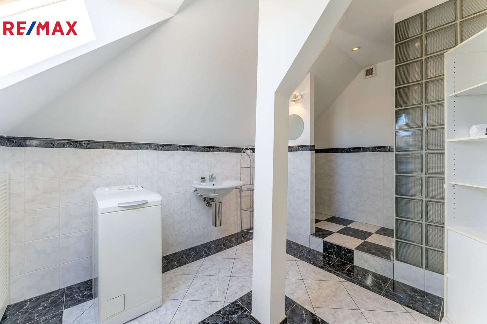 - prostorná koupelna se sprchovým koutem, toaletou (10,4 m²) a úložnými prostory