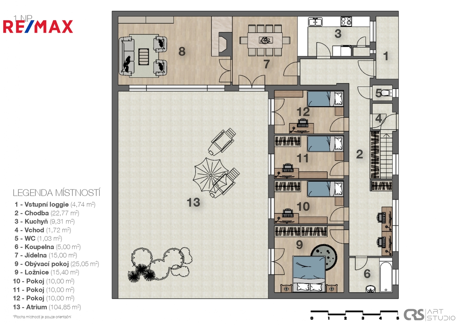 V přízemí domu máte bytovou jednotku o dispozici 3+1 a technické zázemí, jehož součástí je kotelna, sklad, dílna a prádelna. Dále pak garáž pro osobní automobil a vinný sklípek. V patře se nachází hlavní bytová jednotka s pěti obytnými pokoji, kuchyní, jídelnou a dominantou je velká sluneční terasa o výměře 110 m2, kde můžete odpočívat, nebo posedět s rodinou či přáteli u grilování. Celková užitná plocha domu činí 262 m2 (obytná pl. 160 m2) a za zmínku stojí, že délka hlavního bytu z jednoho konce na druhý měří 28,29 m. Rozsáhlá plocha střechy se dá využít mnoha způsoby (elektrárna, přístavba, zahrada).