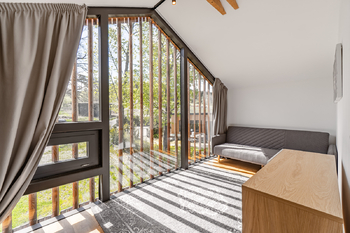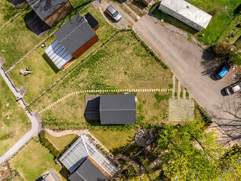 V přízemí chaty se nachází zádveří s šatní skříní, vybavený elegantní kuchyňský kout spojený s prostorným obývacím pokojem, vhodným pro společenské chvíle i relaxaci a moderní koupelna se sprchovým koutem. Ve druhém podlaží se nachází dvě útulné ložnice, což zajišťuje dostatek soukromí a pohodlí. Z každé místnosti se vám dostane překrásného výhledu do přírody.