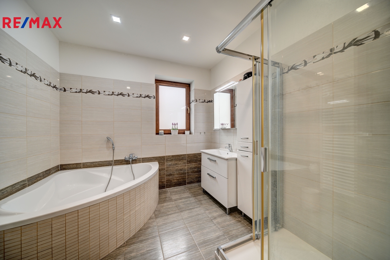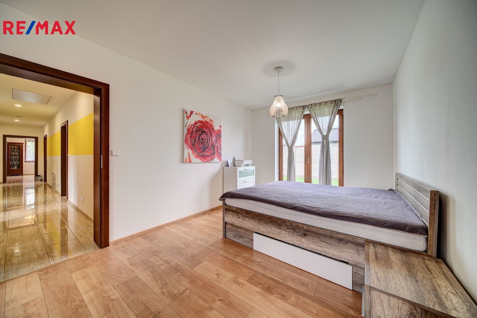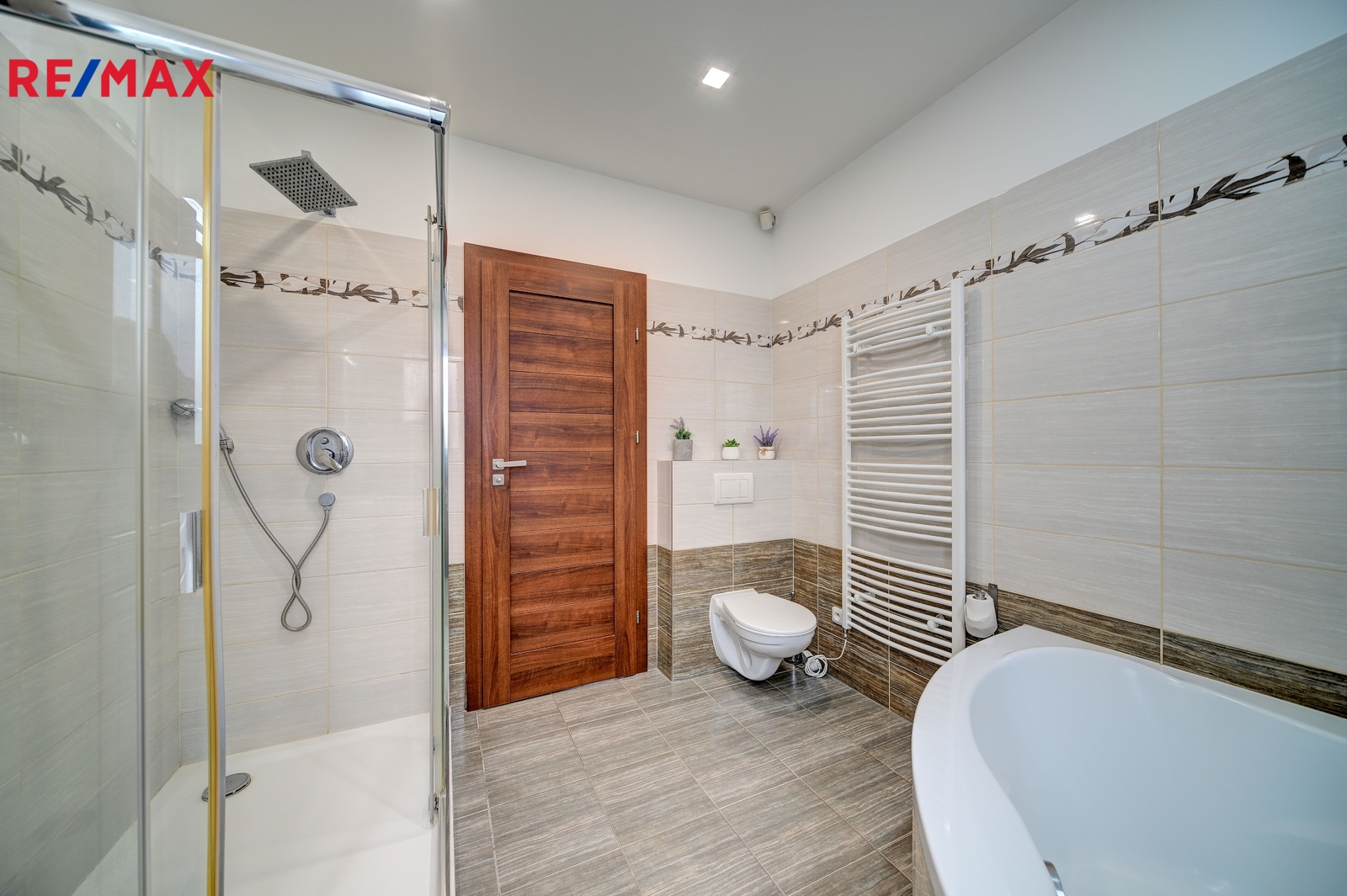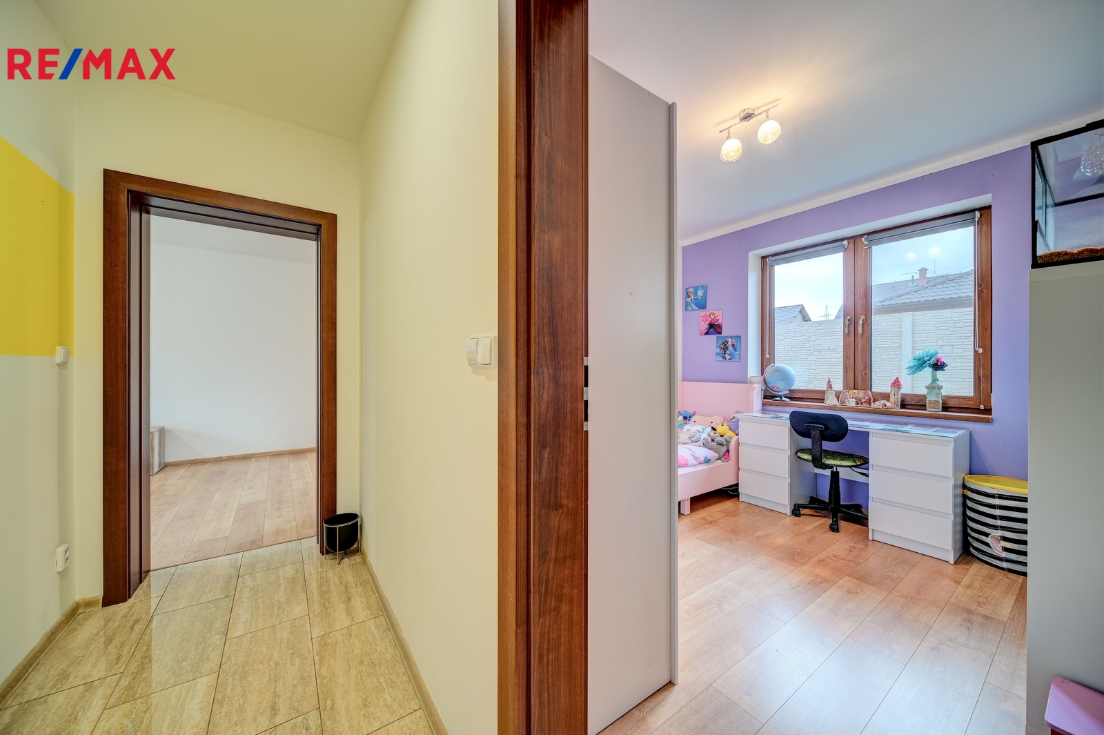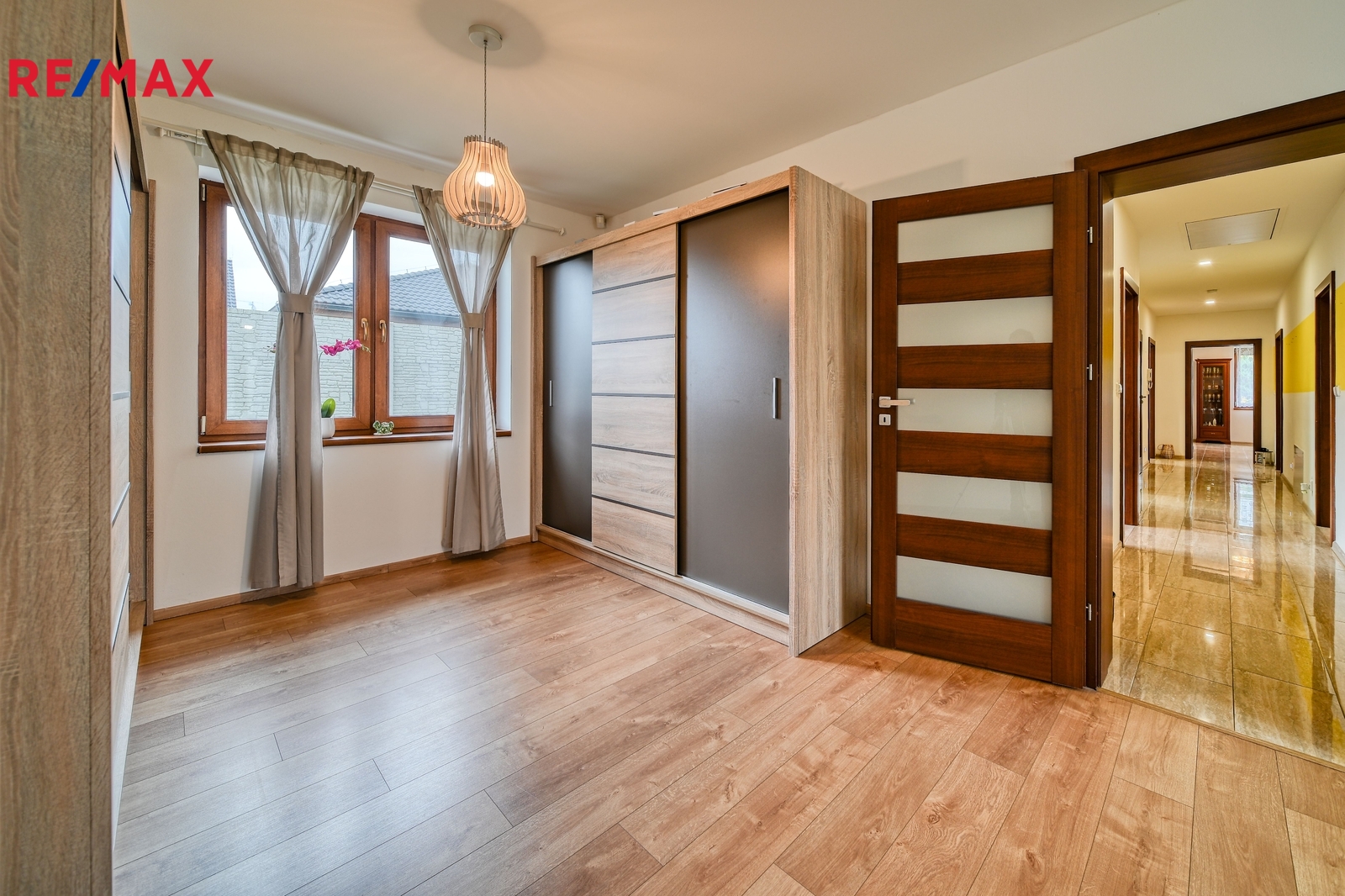 Dispozice dále nabízí: prostornou vstupní chodbu, technickou místnost, samostatnou šatnu, koupelnu s vanou i sprchovým koutem, samostatné WC, čtyři neprůchozí pokoje – vhodné jako ložnice, dětské pokoje, nebo pracovna. Výbava a další benefity: Kvalitní plovoucí podlahy a dlažba.