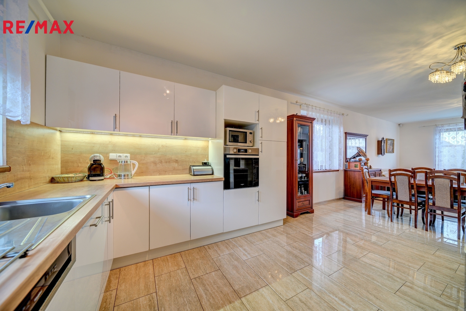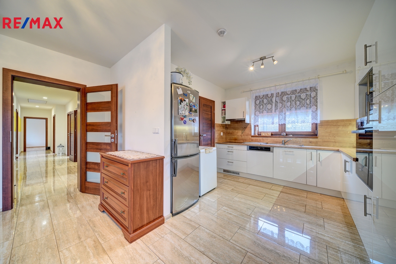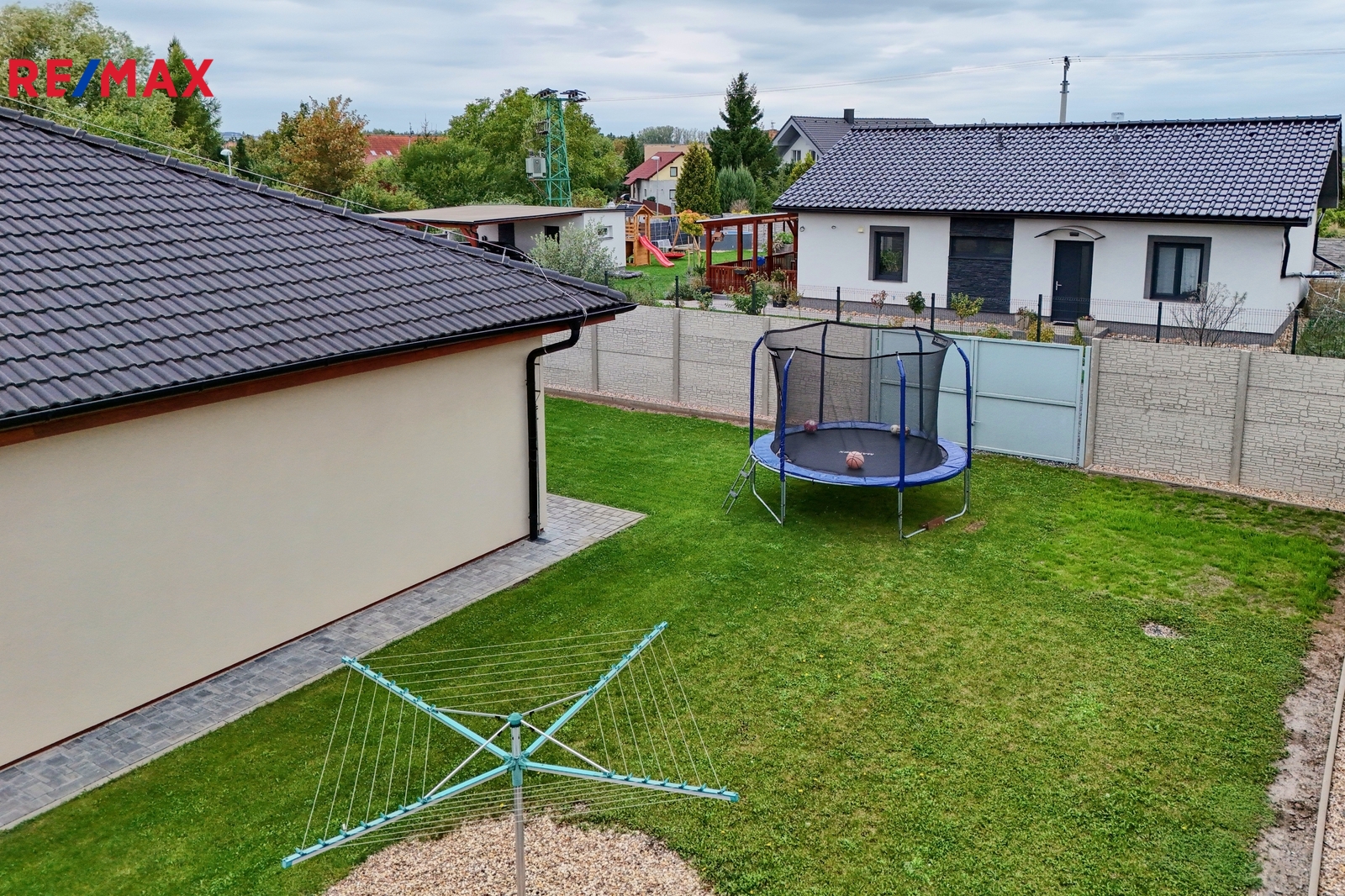 Dominantou domu je prostorný obývací pokoj s velkorysým prostorem pro rodinná setkání, který je plynule propojený s moderní kuchyní vybavenou kvalitními spotřebiči a praktickou spíží. Z obývací části vede přímý vstup na krytou terasu s výhledem do zahrady – ideální místo pro relaxaci, grilování i dětské hry.