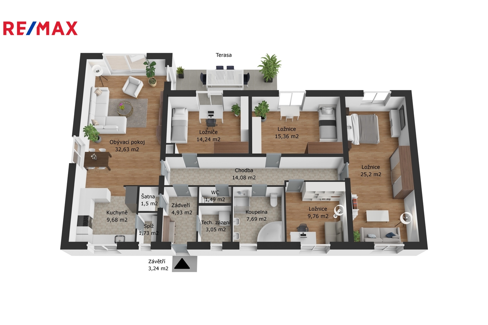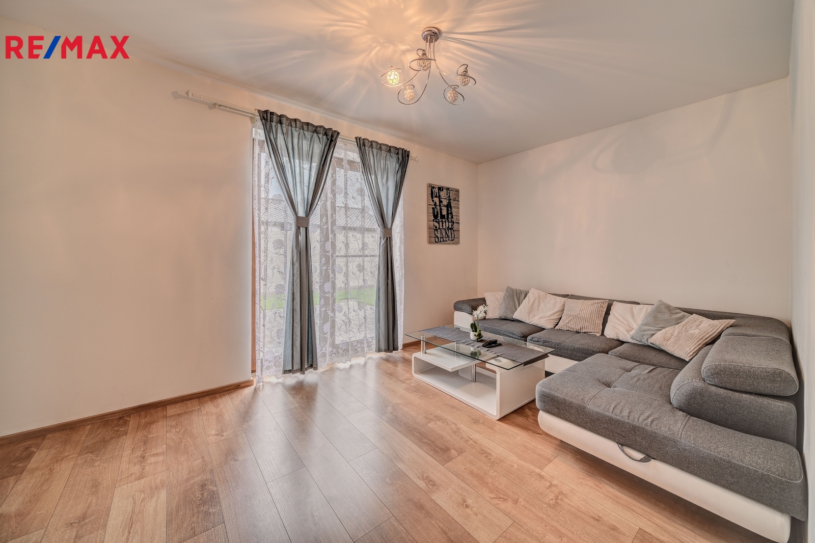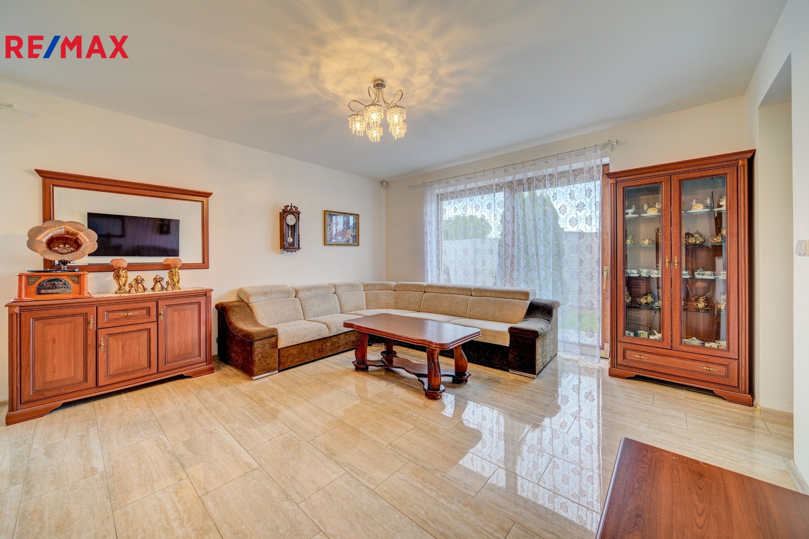 Dominantou domu je prostorný obývací pokoj s velkorysým prostorem pro rodinná setkání, který je plynule propojený s moderní kuchyní vybavenou kvalitními spotřebiči a praktickou spíží. Z obývací části vede přímý vstup na krytou terasu s výhledem do zahrady – ideální místo pro relaxaci, grilování i dětské hry.