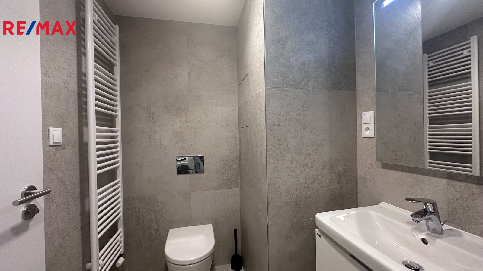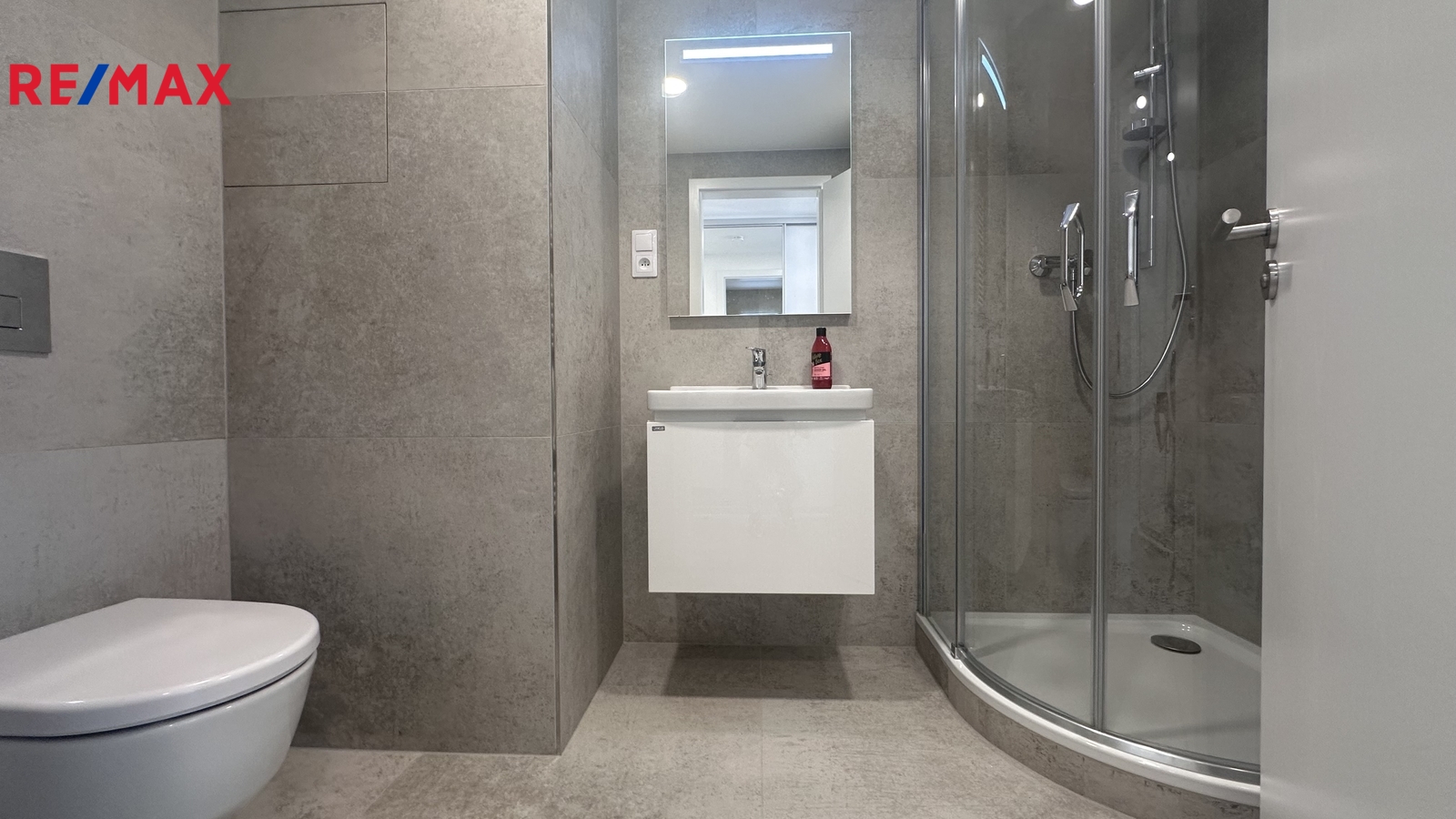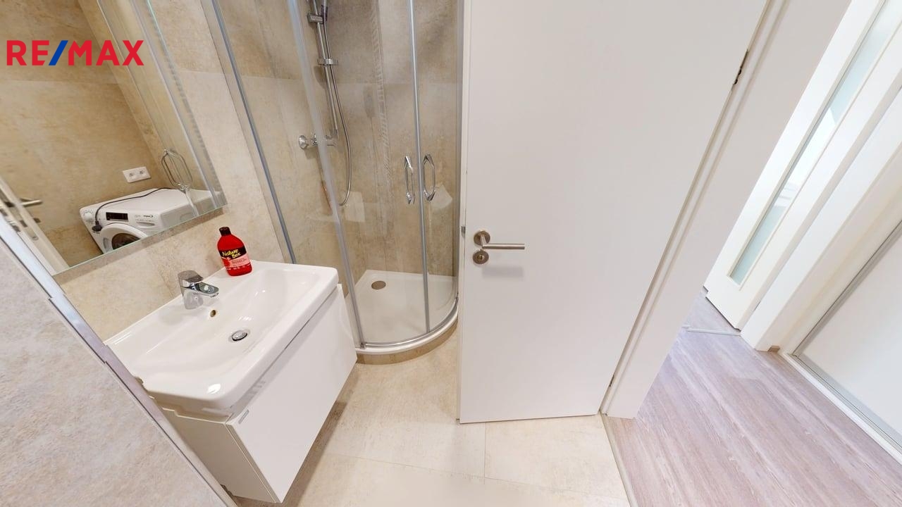 - v koupelně se nachází pračka, koupelnová skříňka, zrcadlo, sprchový kout