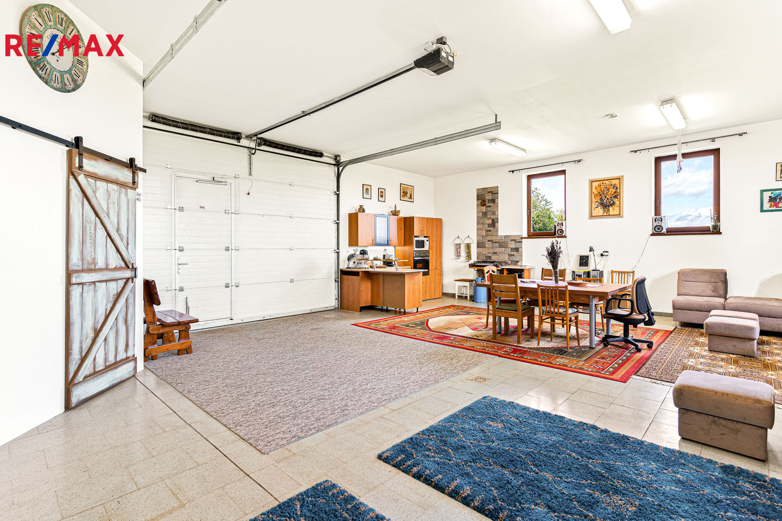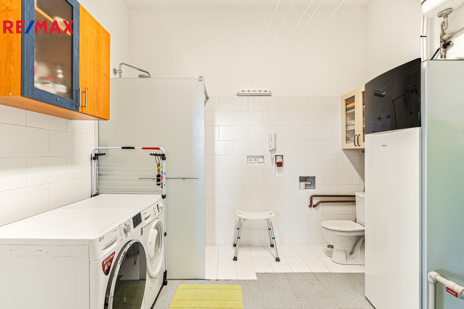 V druhé části domu je pro milovníky prostoru velká víceúčelová místnost s širokým využitím (garáž, dílna, posilovna, sklad, herna, studio, ...). Nyní se zde nachází sauna, dále vestavěná místnost jako sklad či sklípek potravin a místnost s technologiemi pro dům (tepelné čerpadlo, zásobník pitné vody, vodárna) a sprchový kout, WC, pračka, sušička, kuchyňský kout s myčkou.