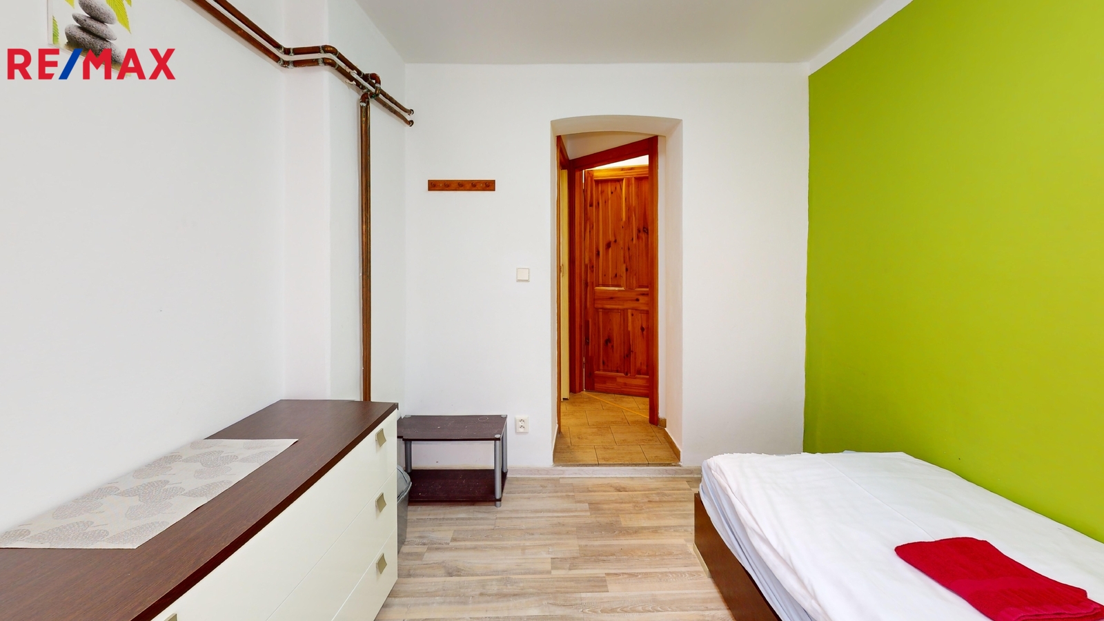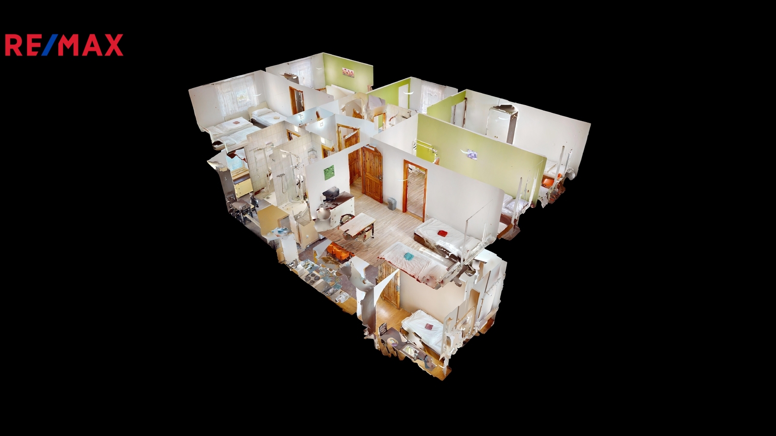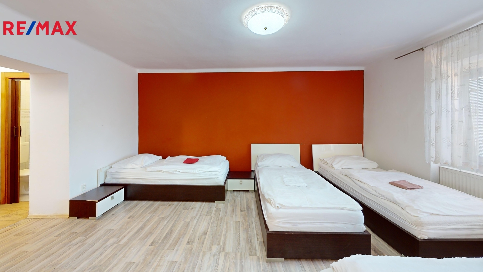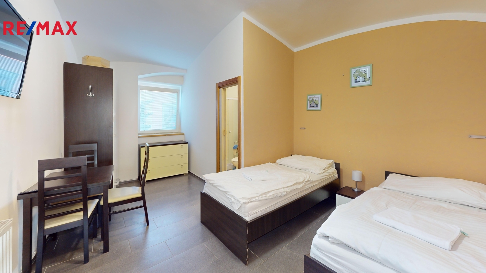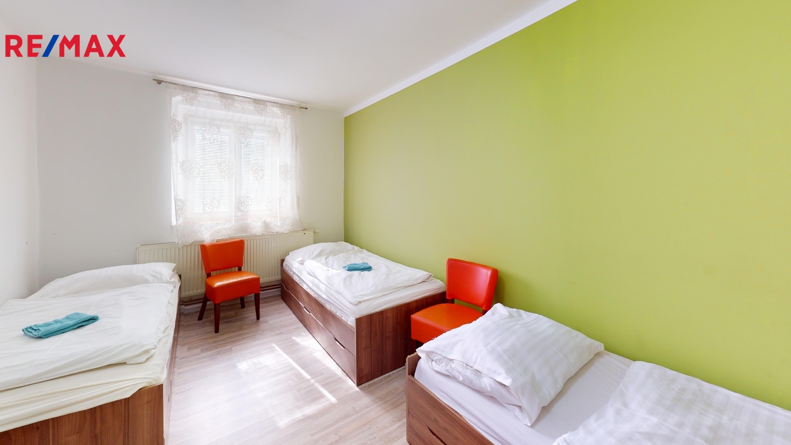 Dispozice: Přízemí: chodba 9 m2, společenská místnost 23,3 m2, pokoje: pokoj číslo 4. (1 x lůžko) 9,8 m2 + koupelna (sprcha + WC) 2,5 m2, pokoj číslo 5. (2 x lůžko) 8,7 m2, pokoj číslo 6. (1 x lůžko) 8,27 m2, pokoj číslo 5. a 6. společná koupelna (sprcha + WC) 2,9 m2, pokoj číslo 7. (2 x lůžko) 15,2 m2 + koupelna (sprcha + WC) 3,2 m2, schodiště do 1. patra 4 m2.