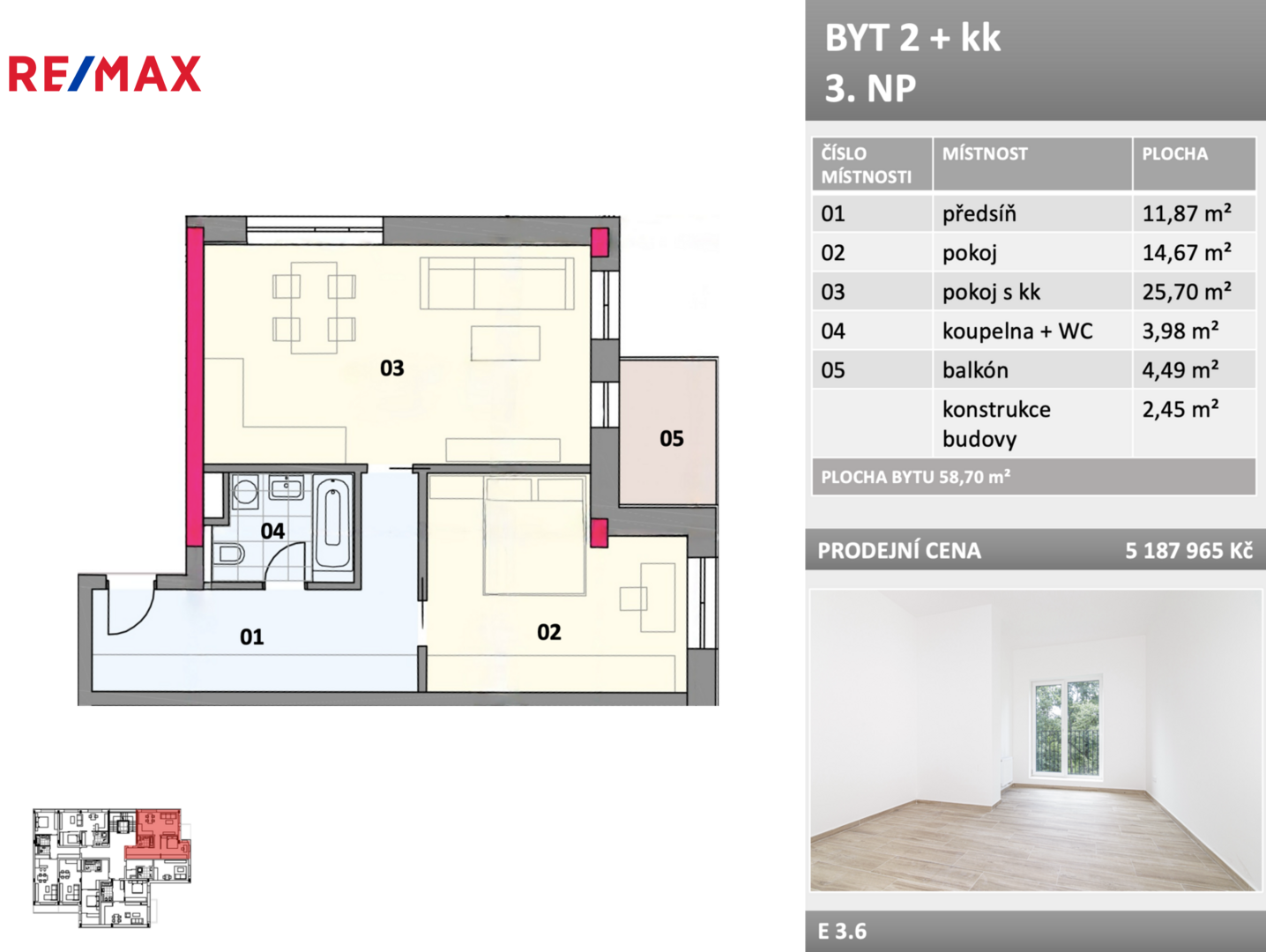 Tato prostorná a vzdušná bytová jednotka o ploše 58,7 m² se nachází v 3. nadzemním podlaží v sekci E, která je postavena jako první etapa projektu. K bytu náleží balkón, který poskytuje příjemný venkovní prostor pro odpočinek.