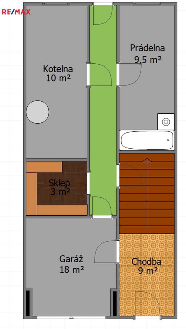 Z chodby jsou po levé straně vstupy do sklepa a kotelny (10 m2), po pravé straně další sklepní prostor a vzadu prádelna (9,5 m2)