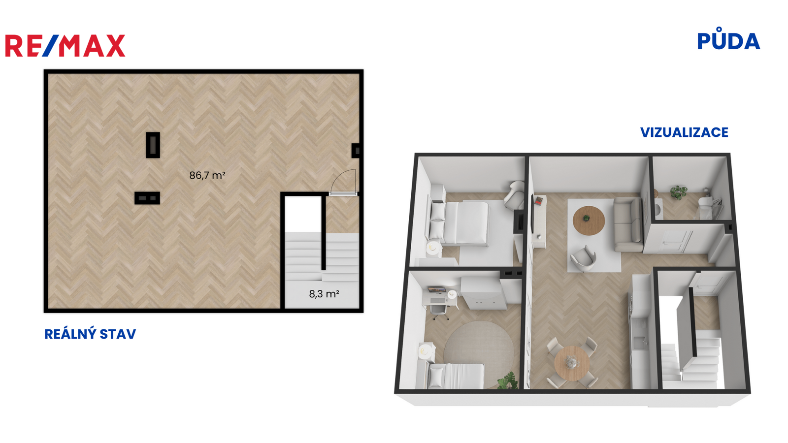 Dům nabízí dispozici 3+1 s užitnou plochou 83 m². Dispozici lze díky půdnímu prostoru o výměře 86,7 m² rozšířit o obytné podkroví nebo dům díky vhodnému dispozičnímu řešení rozdělit na dvě plnohodnotné samostatné bytové jednotky. V přízemí najdete kuchyň, samostatné WC, koupelnu, spíž, dětský pokoj, ložnici a obývací pokoj. Dům je částečně podsklepený – sklep je rozdělen do tří místností o celkové ploše 43,6 m², což se hodí nejen pro skladování, ale i pro dílnu nebo třeba osobní domácí vinotéku. Aktuálně dům nabízí ideální příležitost k přizpůsobení podle vlastních představ.