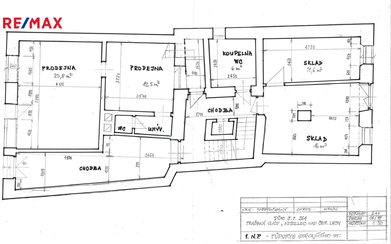 Přízemí: Prodejna, chodba, sklad k prodejně, sociální zařízení, koupelna