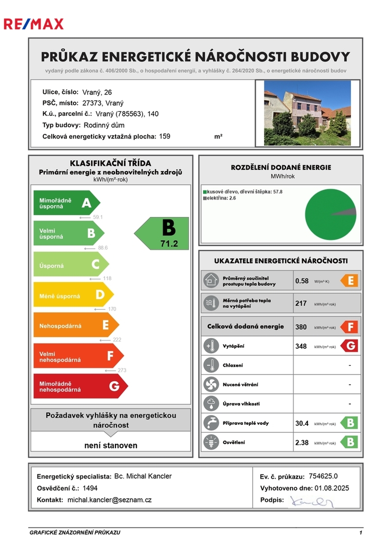 Budova pochází z 20. let minulého století, v letech 2015-2020 prošla vydařenou rekonstrukcí a je ihned obyvatelná. Oplocený pozemek je napojen na inženýrskou síť elektro NN (rozvody v mědi), veřejný vodovod, jímka (napojení na veřejnou kanalizaci v brzké době), plynovod a telekomunikační síť. Vytápění je řešeno krbovými kamny s výměníkem a měděnými rozvody do radiátorů, ale zároveň je připravena instalace plynového kotle s rozvody podlahového topení do chodby a pokoje. Teplou vodu obstarává 120 l bojler. Plastová okna a dřevěné masivní dveře zajišťují tepelnou i zvukovou izolaci. Podlahy jsou nové betonové s keramickou dlažbou, laminem. K dispozici je platný průkaz energetické náročnosti budovy (PENB B – velmi úsporná) a aktuální projektová dokumentace (pasport).