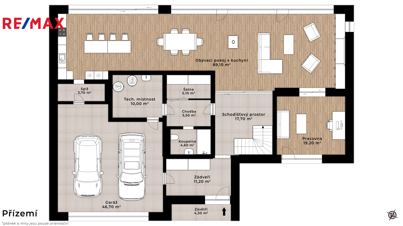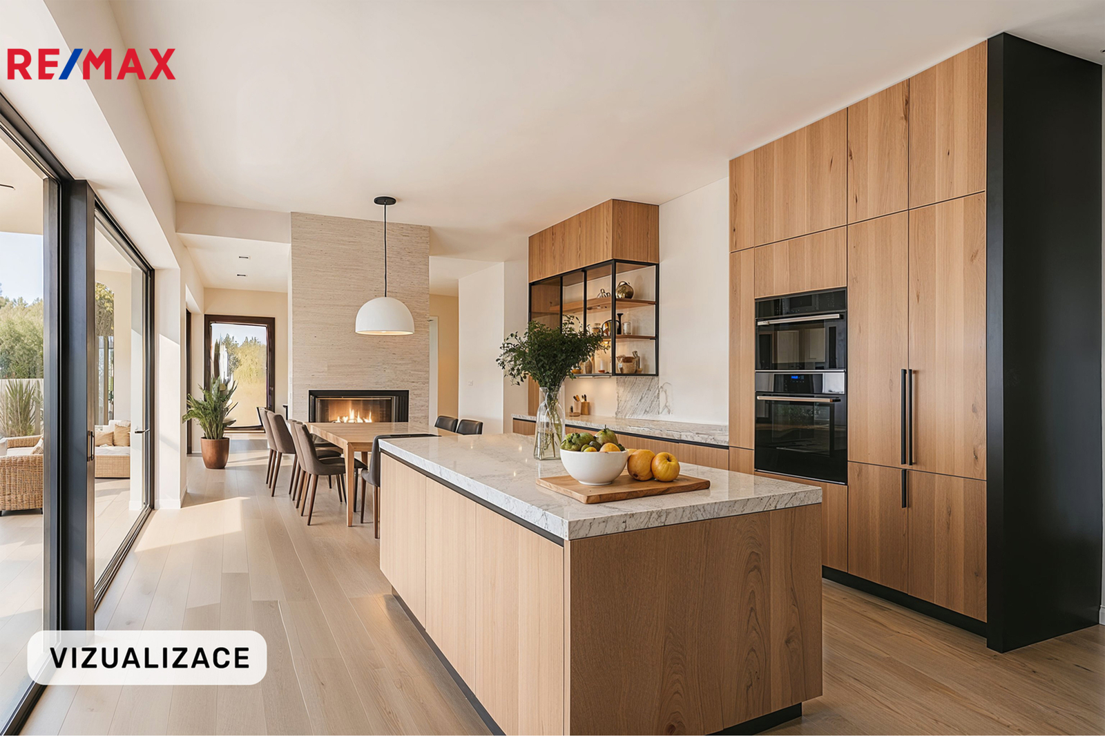 - obývací prostor s kuchyňským koutem (89 m²), s přímým vstupem na terasu a zahradu