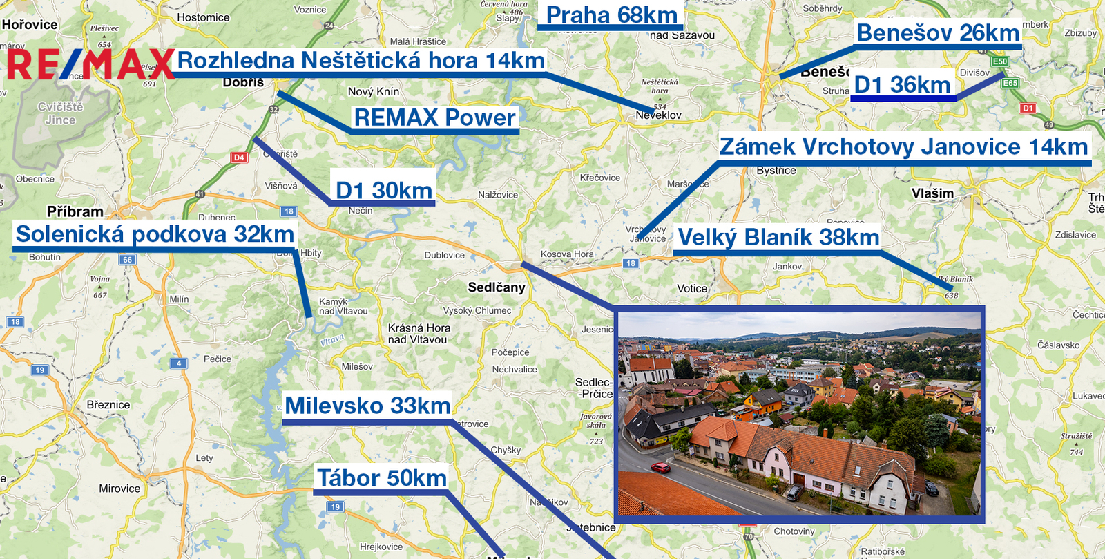 Nachází se v těsné blízkosti centra města Sedlčany, kde se nachází veškerá občanská vybavenost (divadlo, nemocnice, obchody, MŠ+ZŠ, restaurace, atd.).
