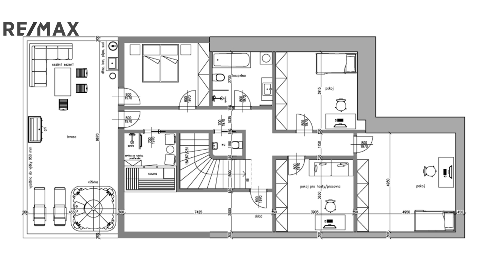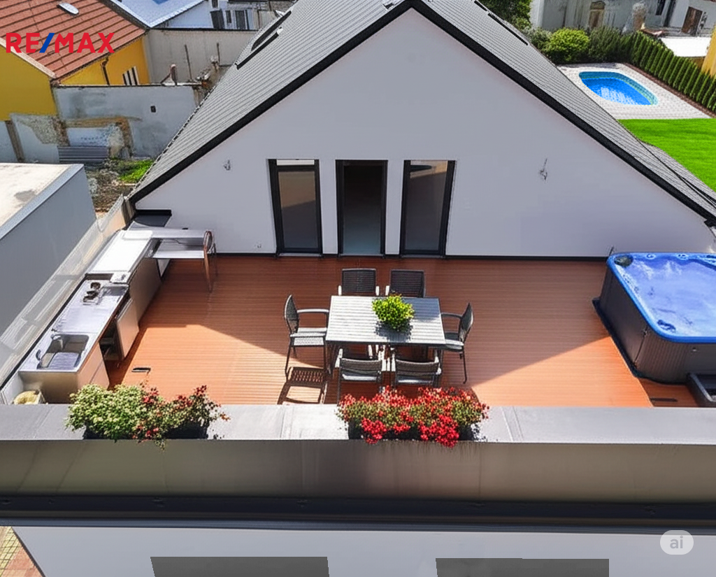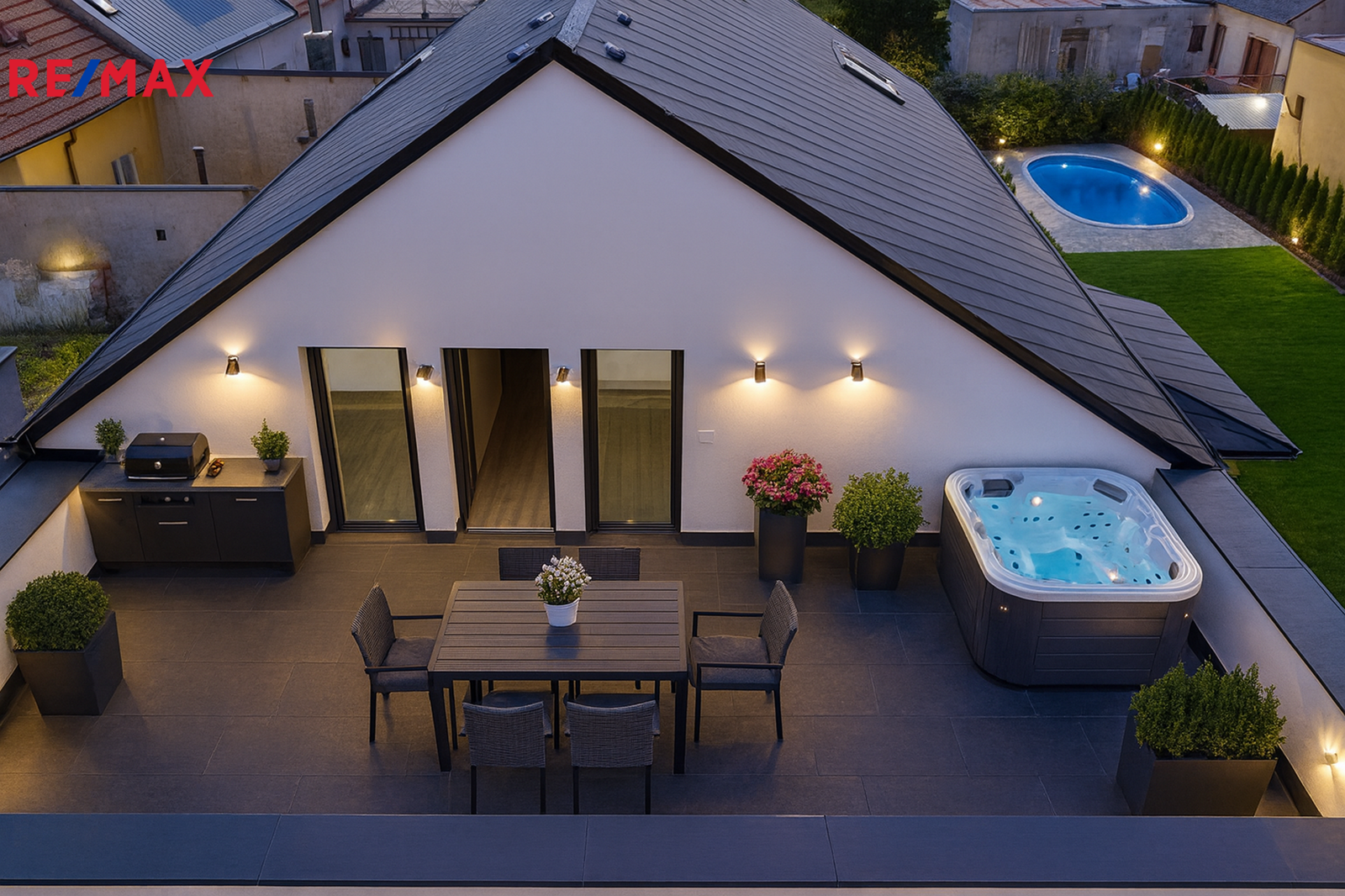 Po náročném dni si dopřejte odpočinek na terase a ponořte do venkovní vířivky Wave o rozměru 220 x 220 cm. V chadných nebo mrazivých dnech Vás velmi potěší pobyt ve vnitřní finské sauně Marimex. Terasa o rozloze 44 m² ve druhém patře navíc nabízí dostatek prostoru pro venkovní kuchyň, posezení nebo relaxační lehátka. Pro lehké sportovní vyžití a volný čas je k dispozici okrasná zahrada s bazénem.