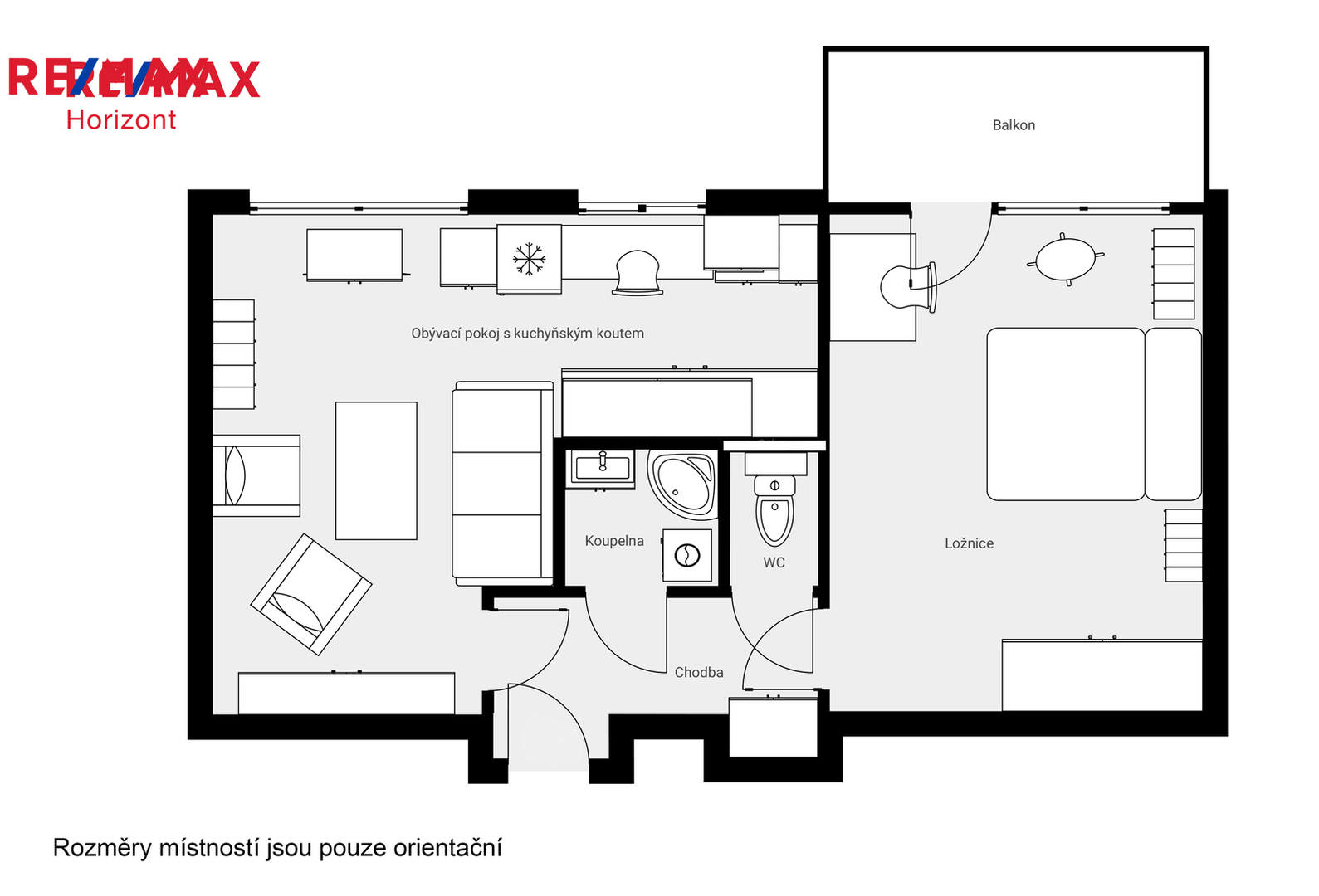 Dispozice bytu zahrnuje obývací pokoj s kuchyňským koutem, ložnici se vstupem na lodžii, koupelnu se zděným jádrem a sprchovým koutem, samostatné WC a předsíň. Byt je v udržovaném stavu s možností okamžitého užívání. Díky nízkým měsíčním nákladům je nemovitost vhodná i jako investiční příležitost k pronájmu.