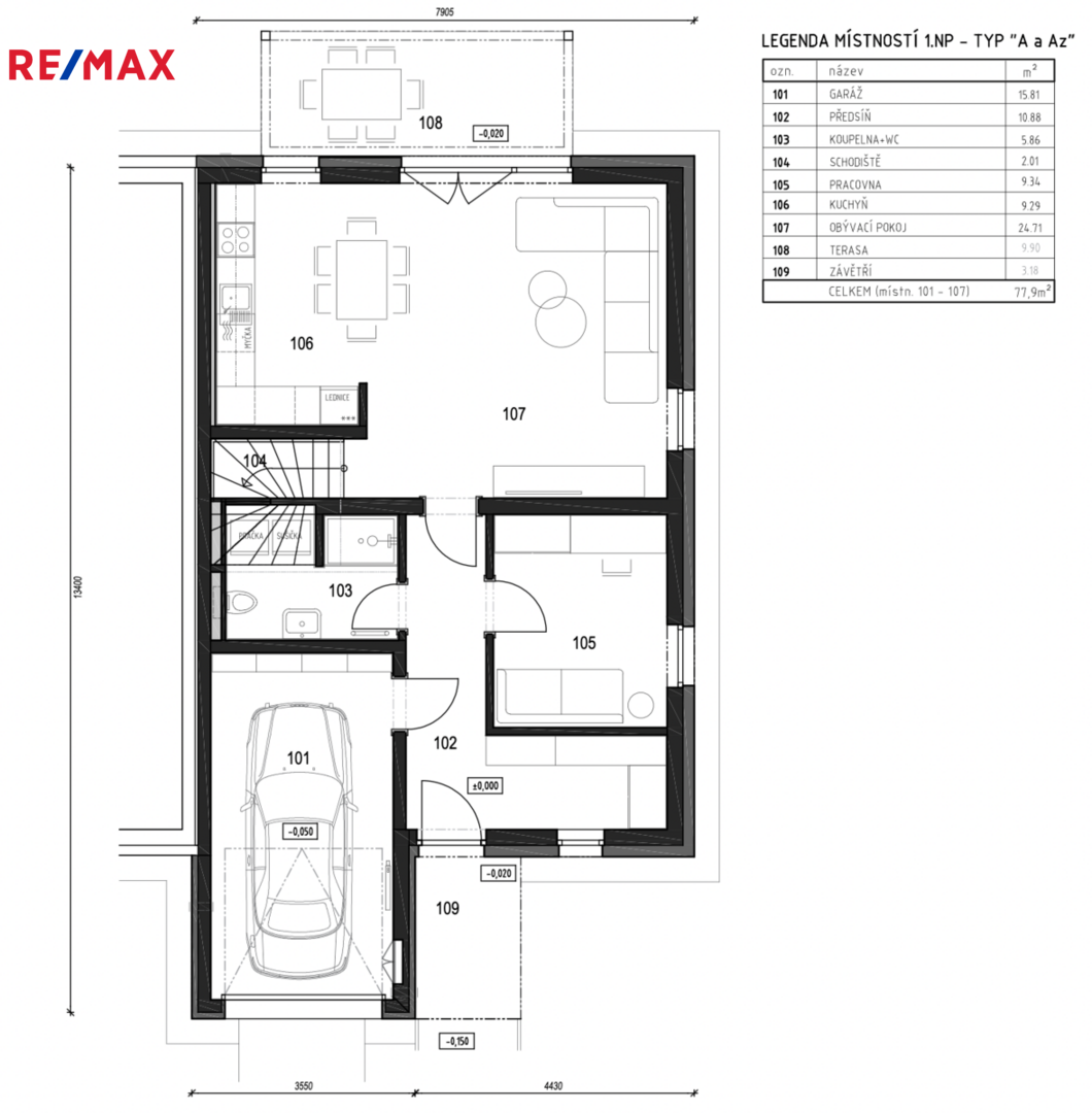 Do domu vstoupíte hliníkovými dveřmi do předsíně, kde je dostatek místa pro umístění šatní skříně a botníku. Hlavním prostorem je světlý, jižně orientovaný obývací pokoj s kuchyňským koutem a jídelním koutem se vstupem na zahradu a terasu. Toto uspořádání umocňuje útulnou atmosféru a je ideální pro společné chvíle s rodinou. Kuchyně není vybavena kuchyňskou linkou. V přízemí se dále nachází pracovna nebo pokoj pro hosty a koupelna s WC.