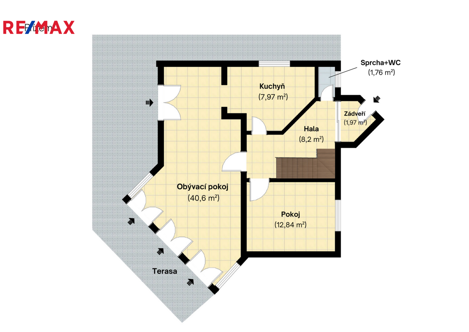 V přízemí domu se nachází obývací část s přímým vstupem na dvě terasy orientované na jih a západ. Obývací pokoj je propojen s jídelnou a kuchyní, je světlý, slunný, z jihu i západu prosklený. Dále je zde pokoj pro hosty/pracovna, malá koupelna s WC.