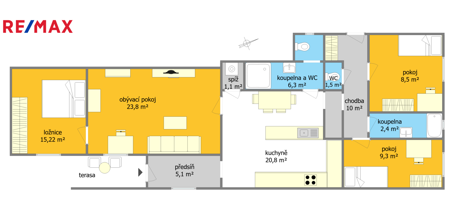 - kuchyně s jídelnou (20,9 m²) s moderní linkou, ostrůvkem a vestavěnými spotřebiči,