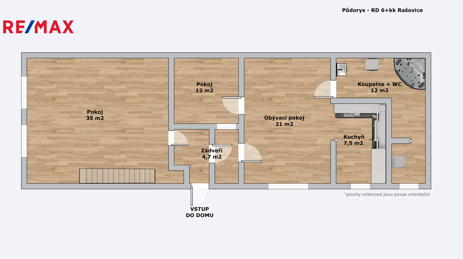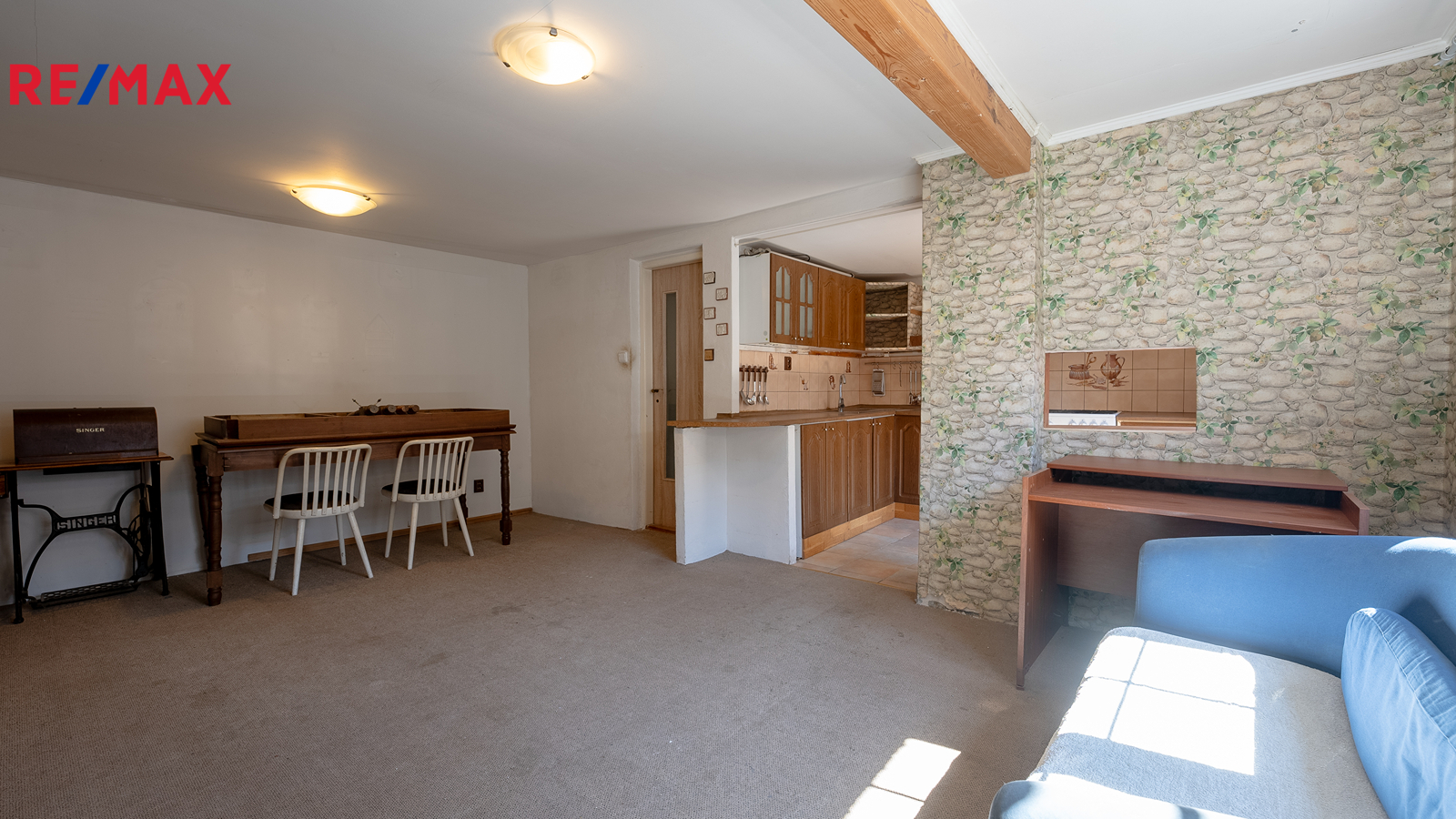 V přízemí domu najdeme 3 pokoje, kuchyni a prostornou koupelnu s toaletou.