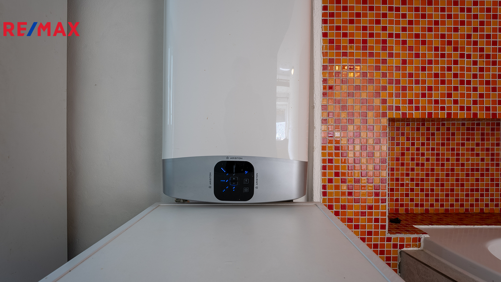 Topit v domě je možné krbovými kamny na pevná paliva nebo elektrickými přímotopy. Teplá voda je zabezpečena elektrickým kotlem. Plyn v domě není, přípojka je však před domem, nic tedy nebrání tomu připojit dům i na plyn.