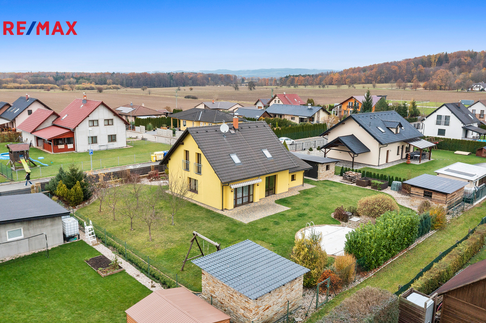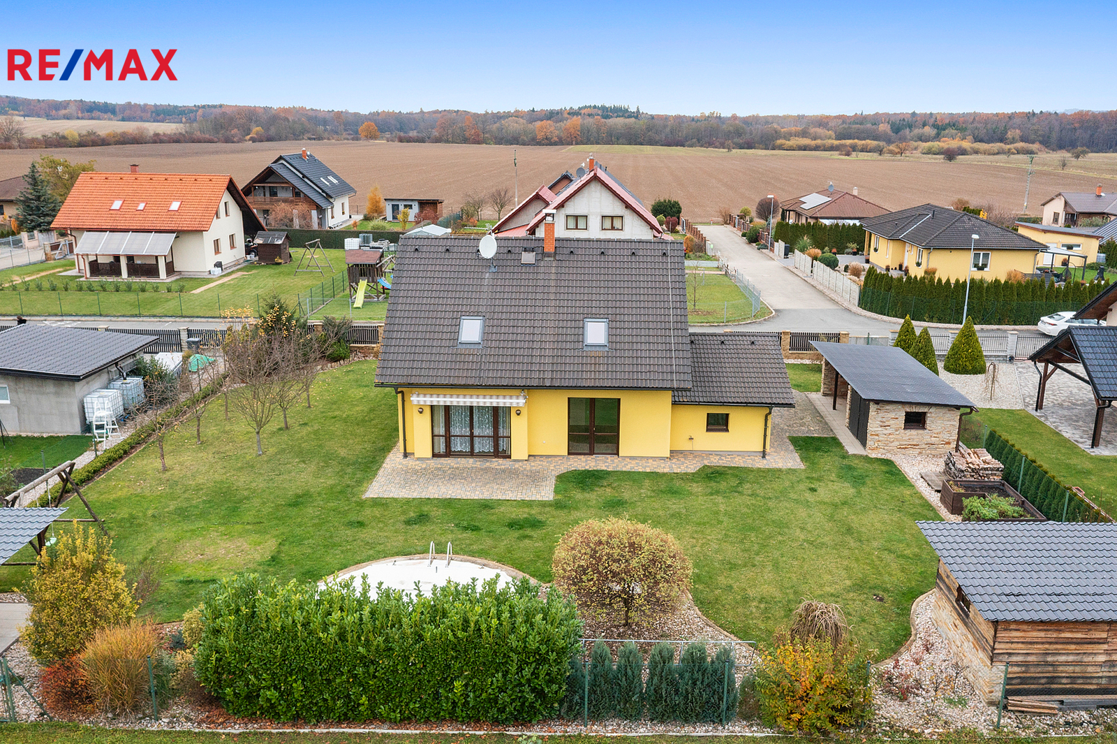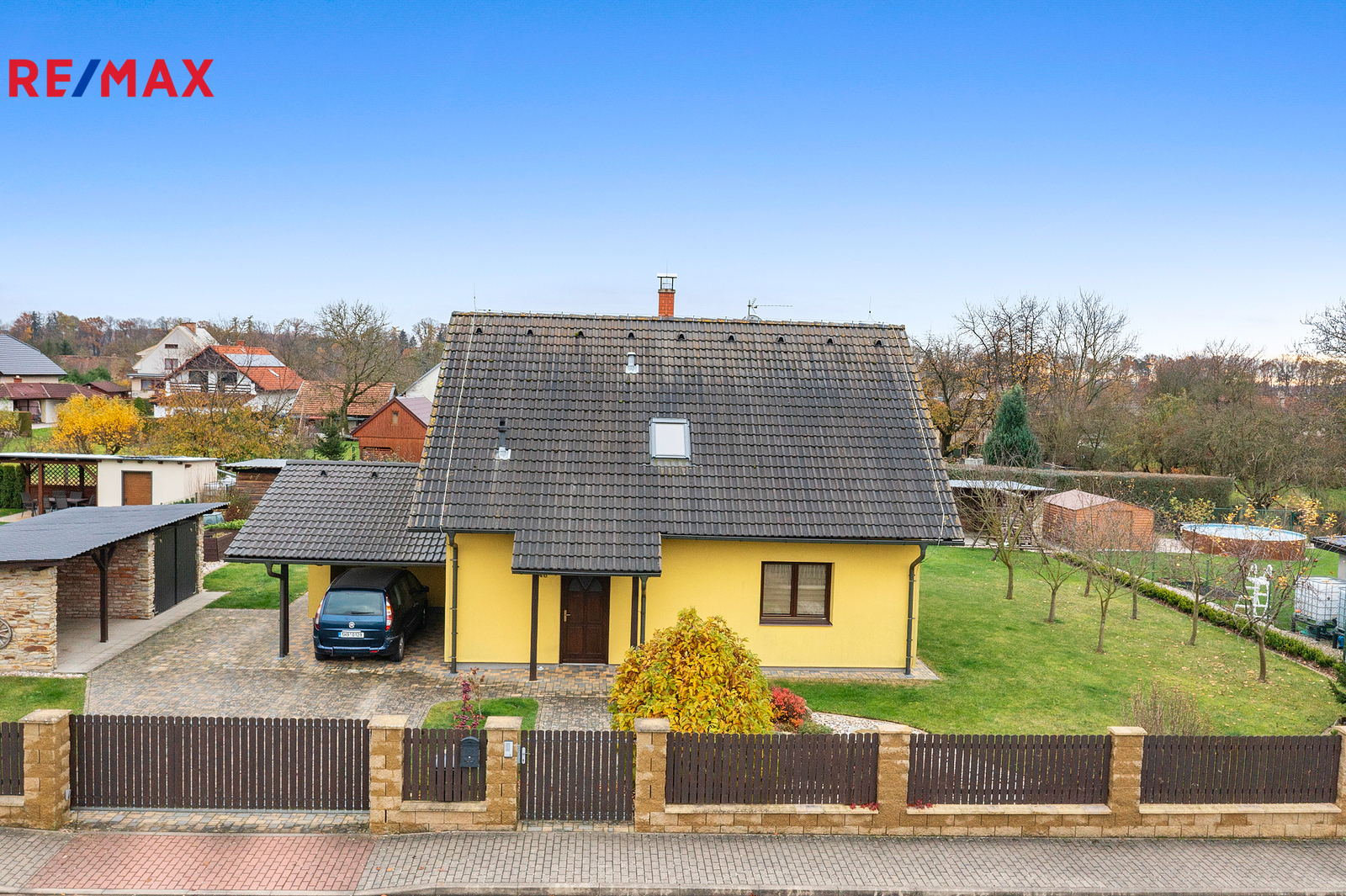 Ve výhradní zastoupení společnosti RE/MAX Future nabízíme k prodeji zděný rodinný dům o dispozici 5+kk se skladem, krytým parkovacím stáním a dalším příslušenstvím, který se nachází na pravidelném pozemku o celkové výměře 1057 m2. Typový rodinný dům od renomované architektonické kanceláře byl postaven v roce 2010 a jeho obvodové zdivo je tvořeno cihlou Porotherm a navíc zatepleno. Do detailů promyšlená dispozice stavby poskytuje v přízemí obývací prostor s kuchyňským a jídelním koutem a prostorný samostatný pokoj, obě dvě místnosti mají přístup francouzskými okny na zahradu s terasou orientovanou jižním směrem. V podkroví se nacházejí další tři plnohodnotné pokoje. V obou podlažích kromě komunikačních prostor jsou umístěny koupelny s toaletou, v přízemí se sprchovým koutem, v podkroví s rohovou vanou. Dispozici domu doplňuje sklad se samostatným vchodem ze zahrady a kryté parkovací stání přímo proti vjezdovým posuvným vratům na dálkové ovládání. Úložný prostor (spíž) také pod schody do podkroví, v koupelně v podkroví a pod hřebenem v půdním prostoru. Vytápění rodinného domu zajišťuje plynový kotel s podlahovým vytápěním a alternativně krbová vložka s teplovzdušným rozvodem do místností a tak společně s kvalitní konstrukcí pláště budovy bylo dosaženo vynikající energetické náročnosti třídy B. Moderní kuchyňská linka je vybavena vestavěnými spotřebiči, na podlahách ve všech místnostech vinyl, do podkroví vedou schody z masivu. Podkrovní místnosti prosvětleny okny do štítových zdí a částečně střešními okny, terasu zastiňuje stahovací markýza. V domě instalováno zabezpečovací zařízení.
