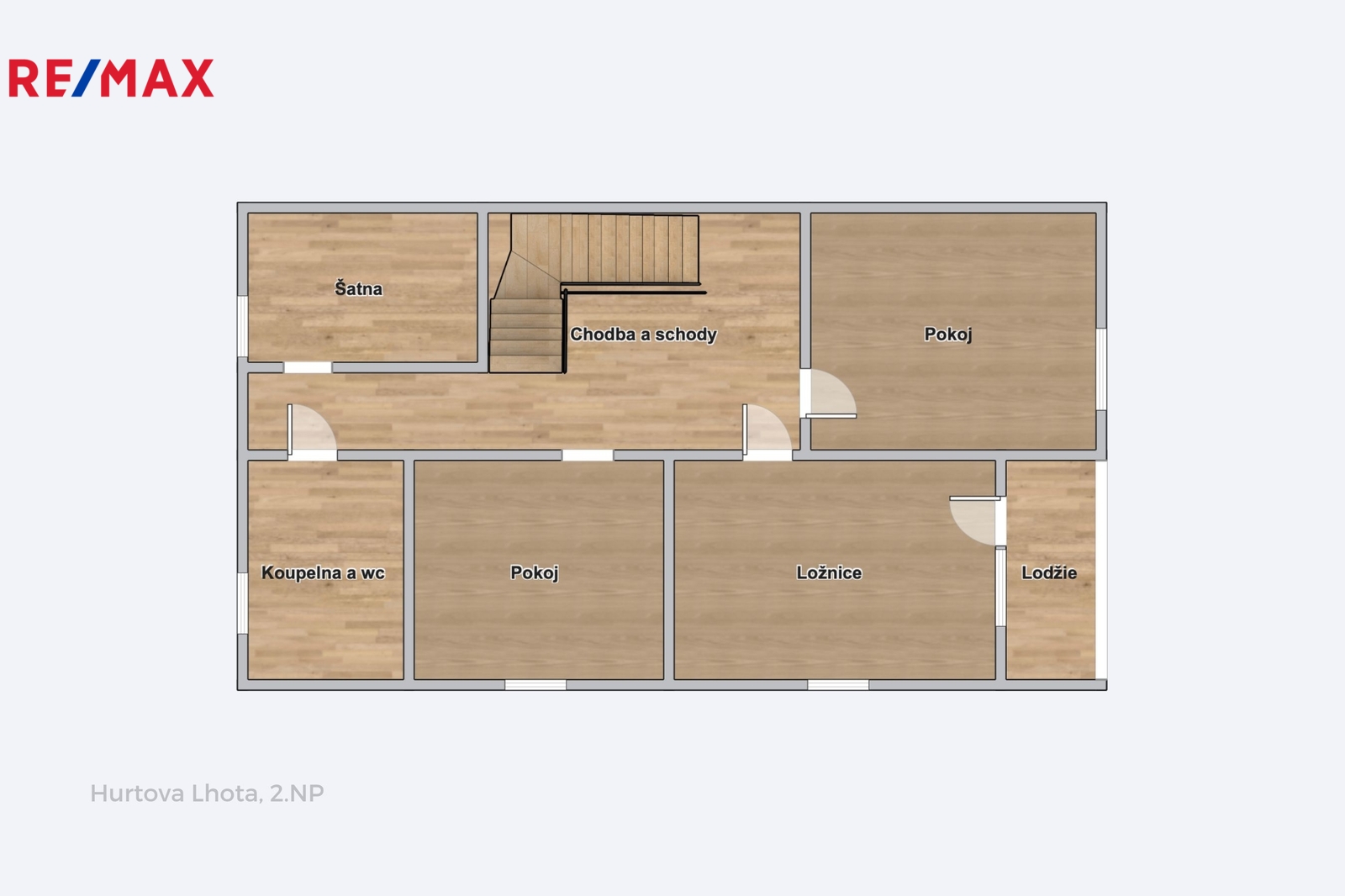 • Podkroví - Klidová zóna domu nabízí tři neprůchozí pokoje, z nichž jeden má vstup na lodžii s výhledem do zahrady. Dále je zde praktická šatna a druhá koupelna s vanou a WC.