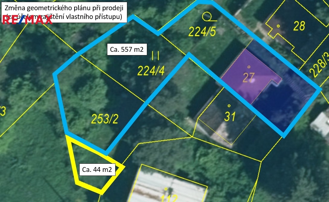 Při prodeji dojde k úpravě hranice pozemků tak, aby byl k prodávané nemovitosti zajištěn vlastní přístup - viz. přiložený obrázek: prodáván je tedy modře ohraničený pozemek (557 m2) a ideální polovina na žlutě ohraničeném pozemku (44 m2).