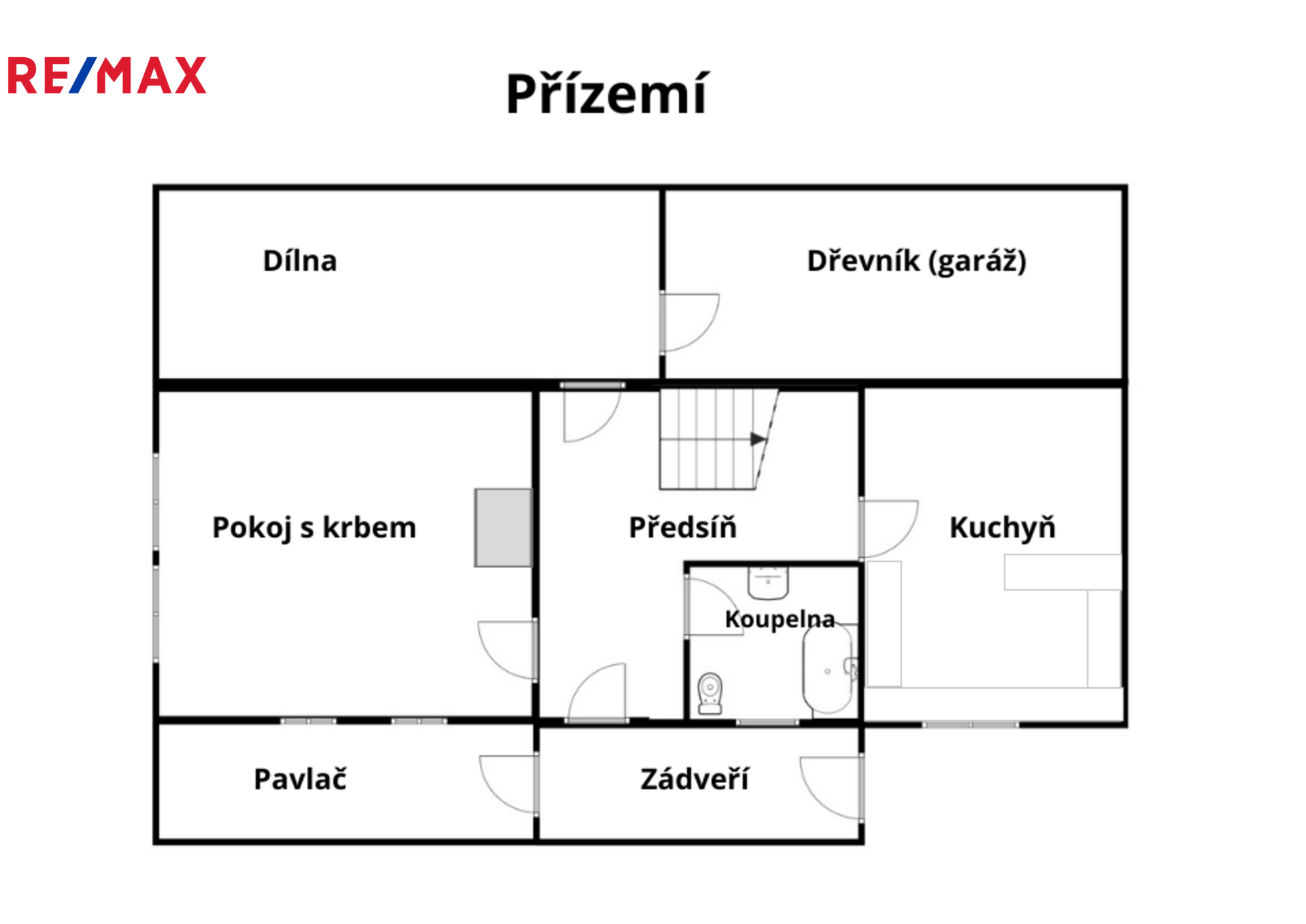 V přízemí, po vstupu přes zádveří, vás přivítá chodba. Odtud se dostanete do velké obytné místnosti s krbem, který nejen že zahřeje v zimních měsících, ale také vytvoří nezapomenutelnou atmosféru. Kuchyně je dostatečně prostorná a vejde se do ní i jídelní kout. Koupelna s vanou a WC má podlahové topení. Dílna je ideální pro hobby aktivity. Za ní se nachází dřevník, který může sloužit jako garáž nebo další úložný prostor. Z chodby je také vstup do klenutého sklípku, který přímo volá po uskladnění něčeho dobrého.