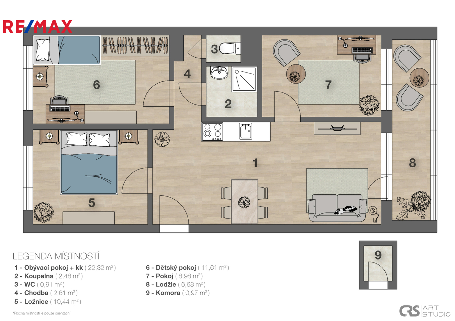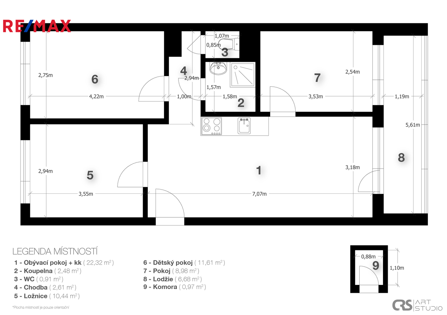 Dostatek úložného prostoru zajistí komora umístěná vedle bytu a sklep.