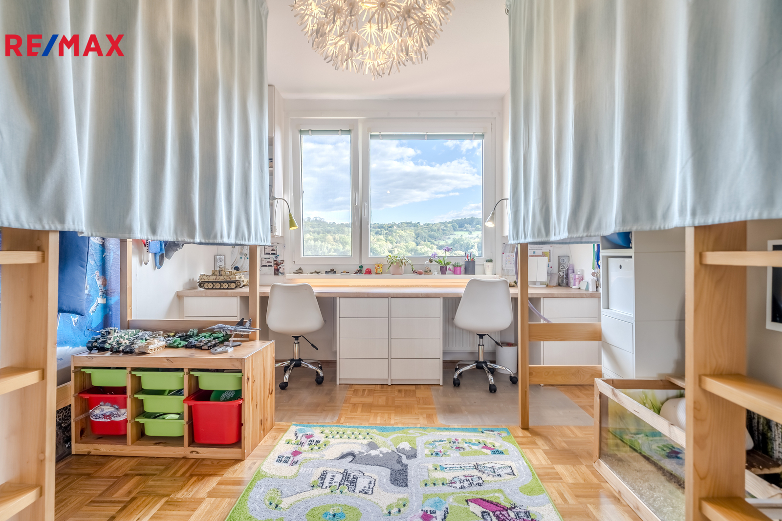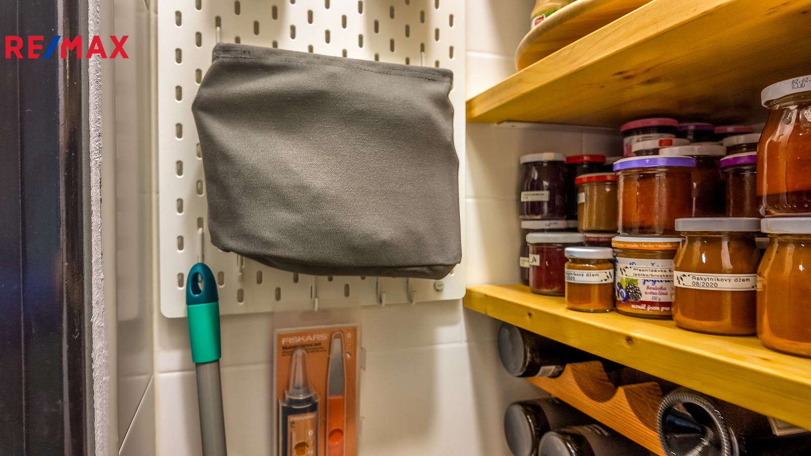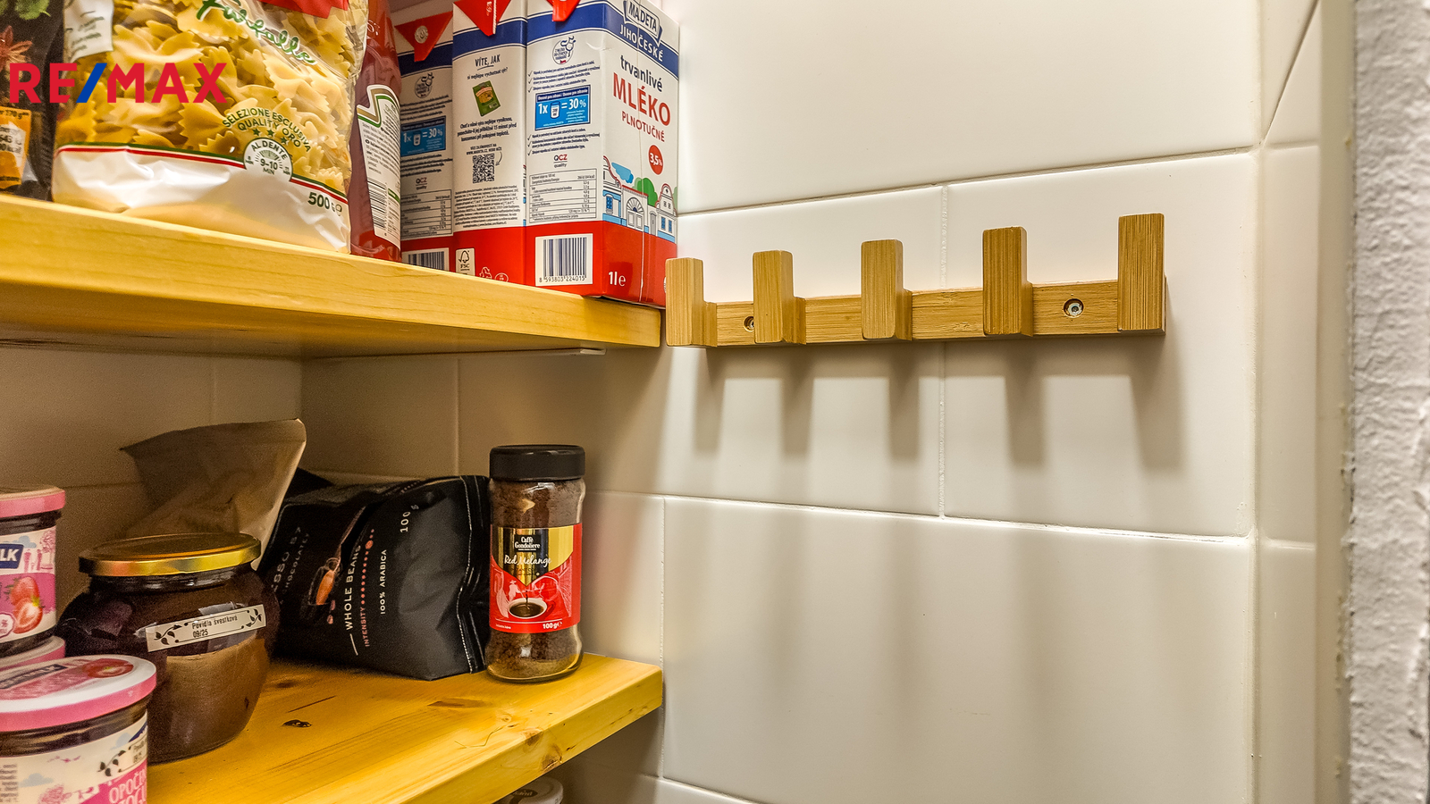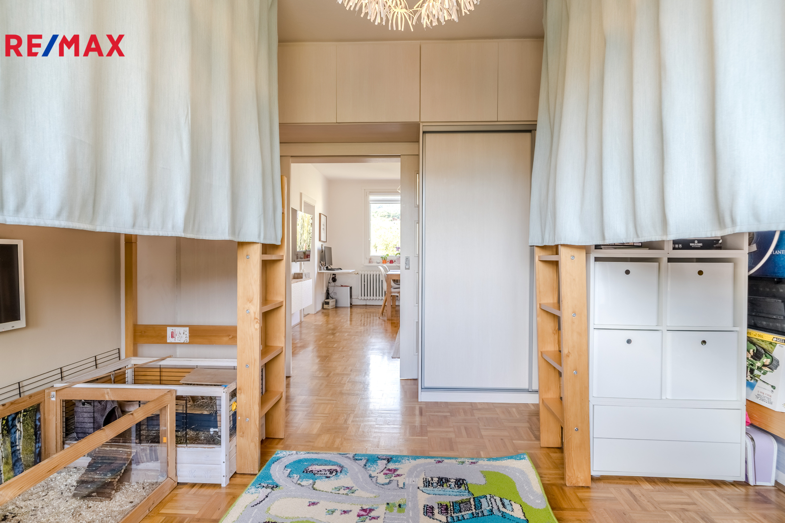 Byt je zcela bez nutnosti dalších investic a zůstává v něm zakázkový nábytek na míru: vestavěné skříně, psací stoly a další prvky, které dokonale využívají prostor.