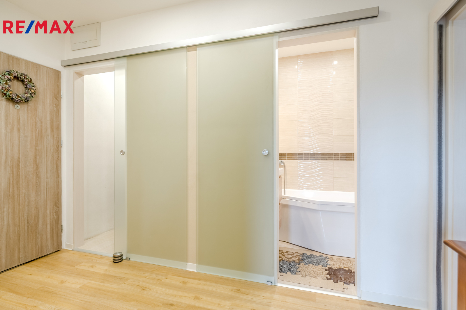 Interiér doplňují elegantní posuvné dveře, které šetří místo a působí moderně.