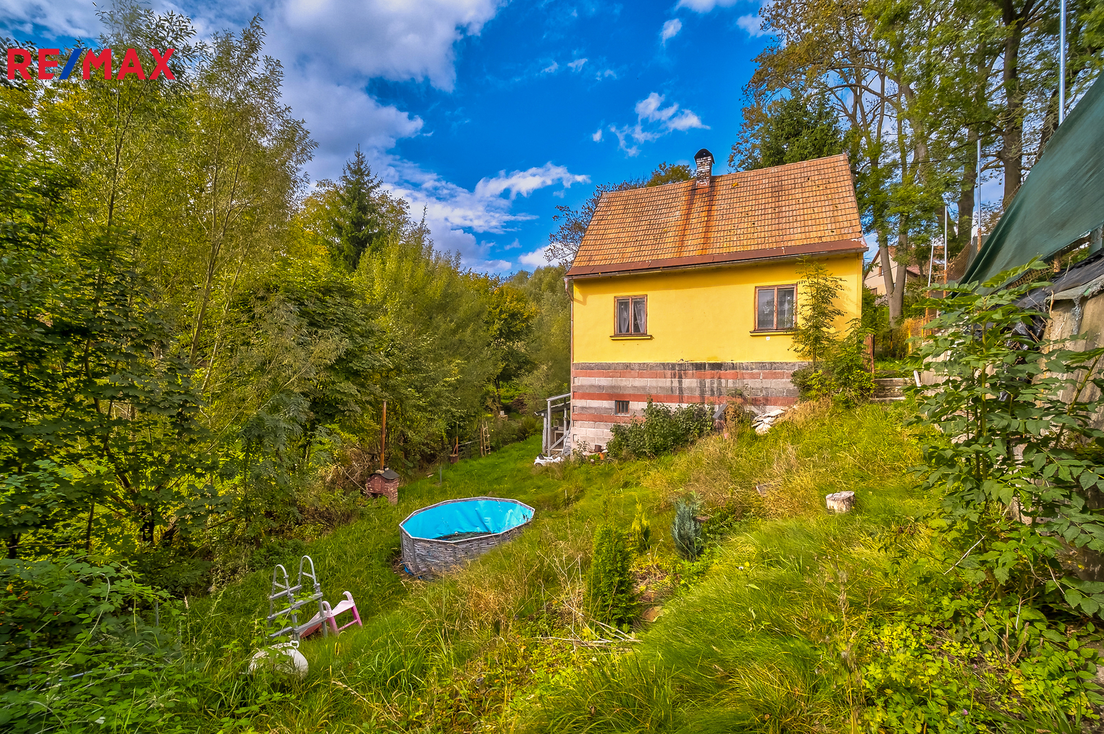 Z obytné části je přímý východ na zahradu s pergolou a posezením u potoka, které vytváří příjemné a klidné prostředí pro odpočinek.
