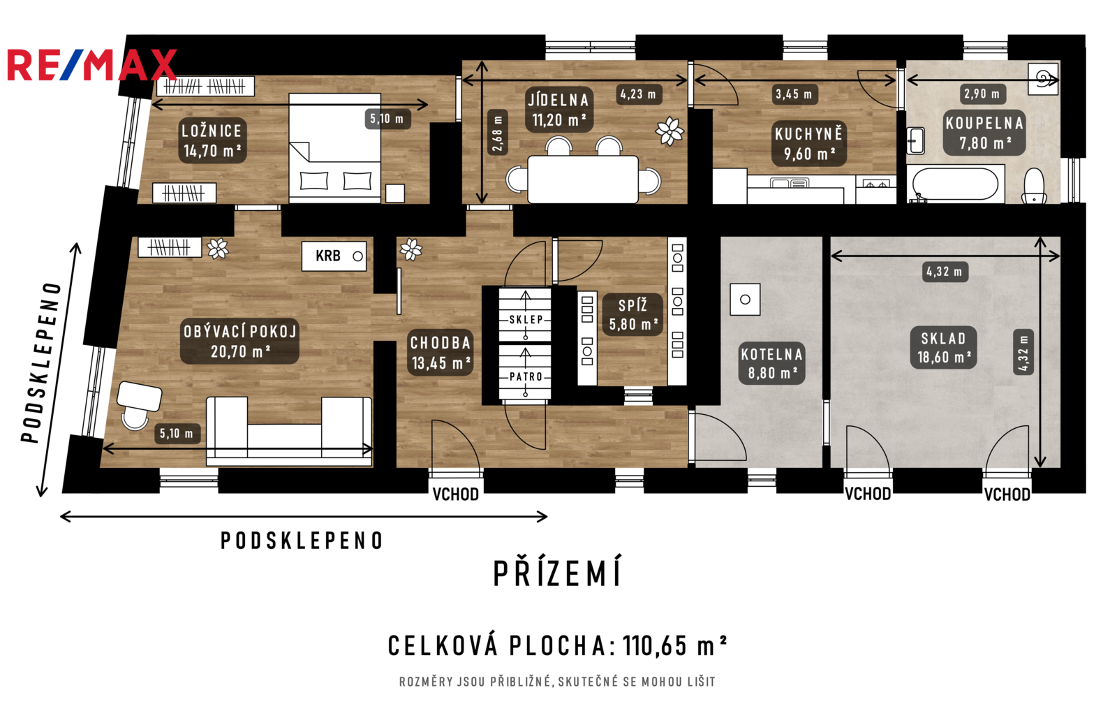 Přízemí: obývací pokoj s krbem, ložnice, jídelna, kuchyně, koupelna, spíž, kotelna a sklad