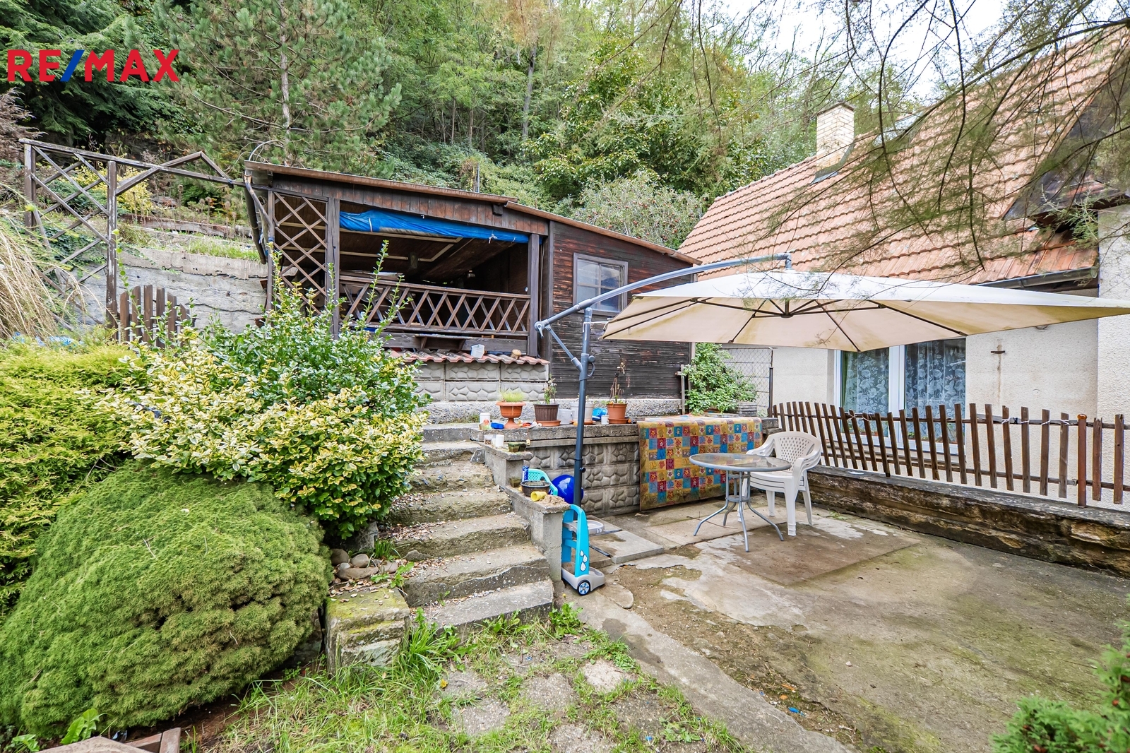 Na zahradě naleznete zahradní domek s posezením a krbem, kde si můžete dopřát setkání s přáteli a grilování. Ze zahradního domku vede vstup do dalšího venkovního prostoru, dříve sloužícím jako voliéra, jež můžete použít například jako sklad.
