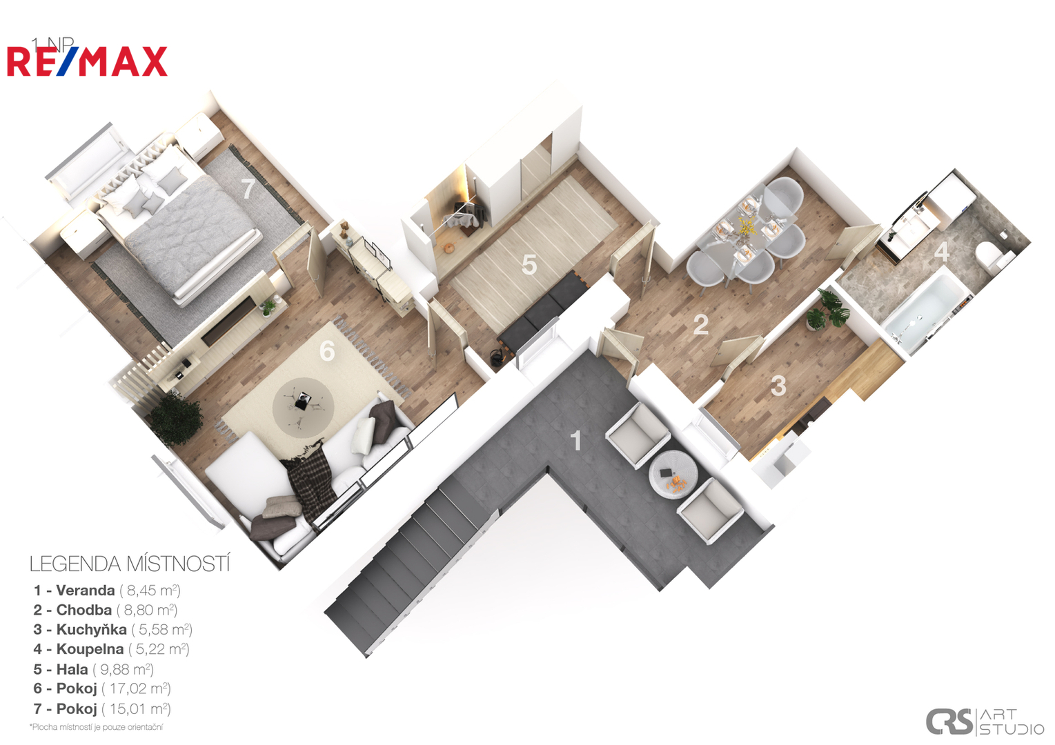 V přízemí domu naleznete obývací pokoj, ložnici, kuchyň, koupelnu.